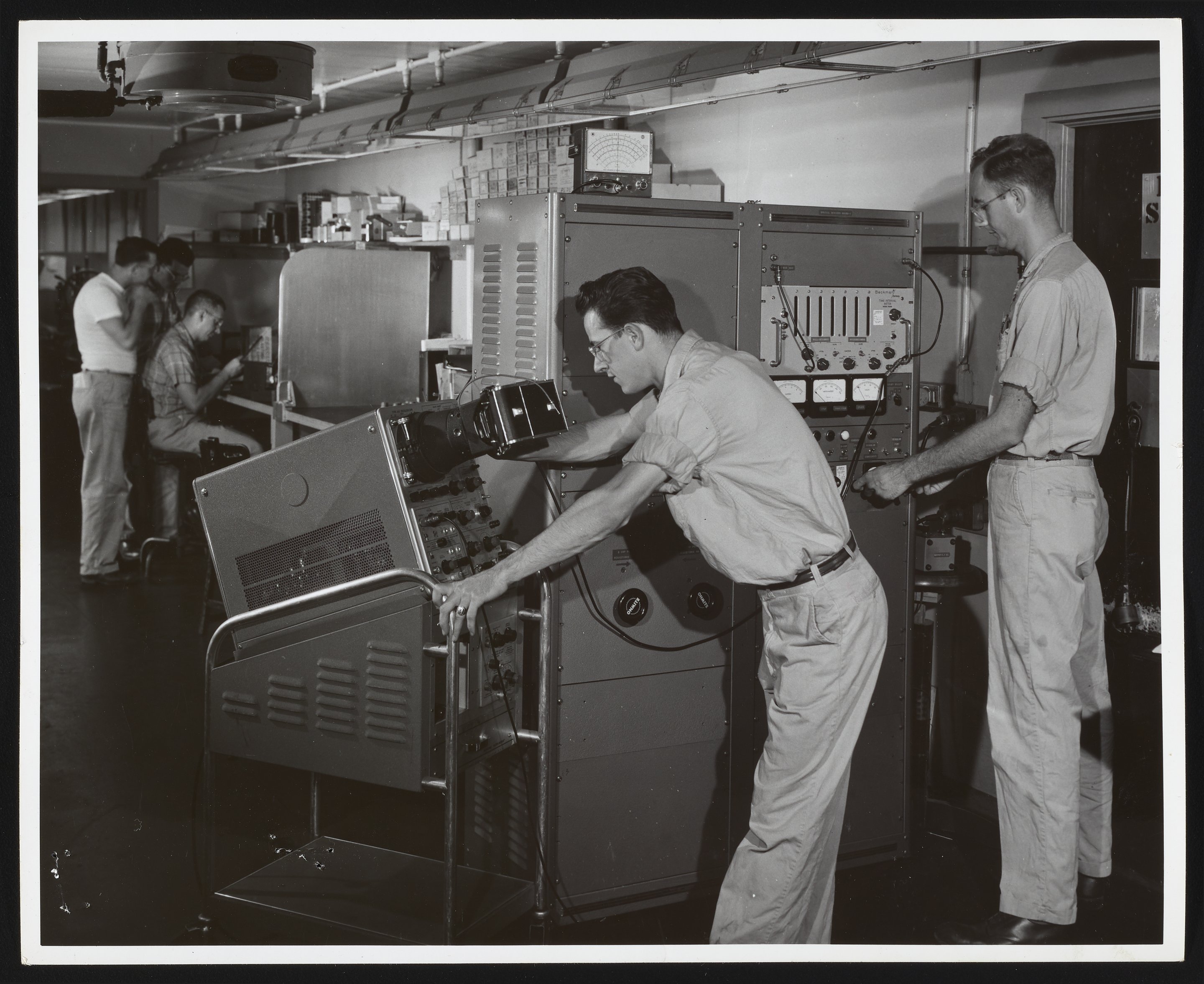 General view of employees Thomas Stauble (left, foreground) and Andrew Tubby (right, foreground) using assorted machinery to test the destructive range and effectiveness of detonators and initiators manufactured at the Hercules Powder Company plant located in Port Ewen, New York. Per notations on the verso of the photograph, Tubby is using a Beckman (Berkeley) Time Interval Meter to apply the correct firing load to a test device located behind the wall, while Stauble photographs the effects of the detonation. The three employees visible in the background are identified as follows (left to right): Henry Meigel; James Ellsworth, Jr.; and Edwin Smedes.