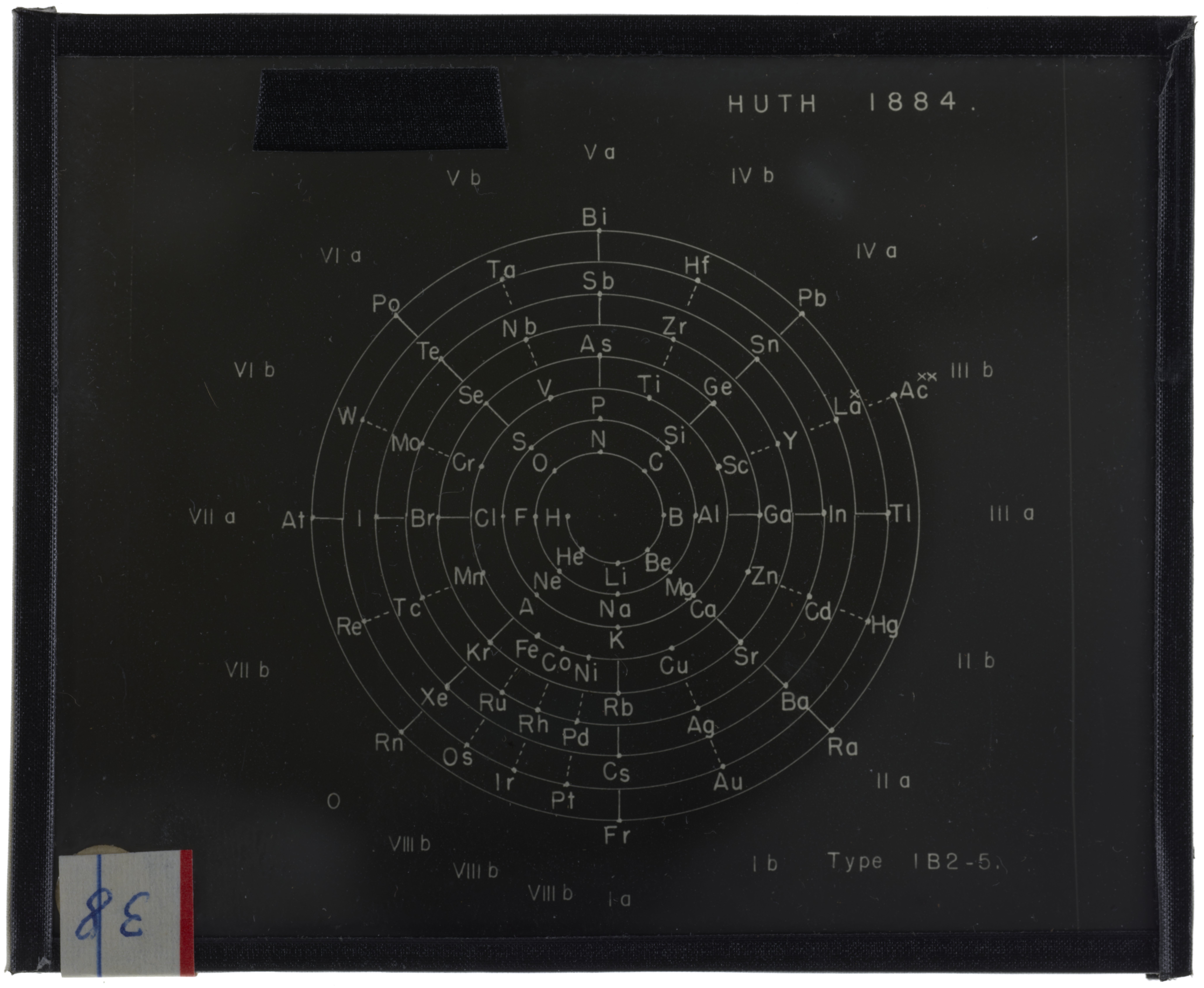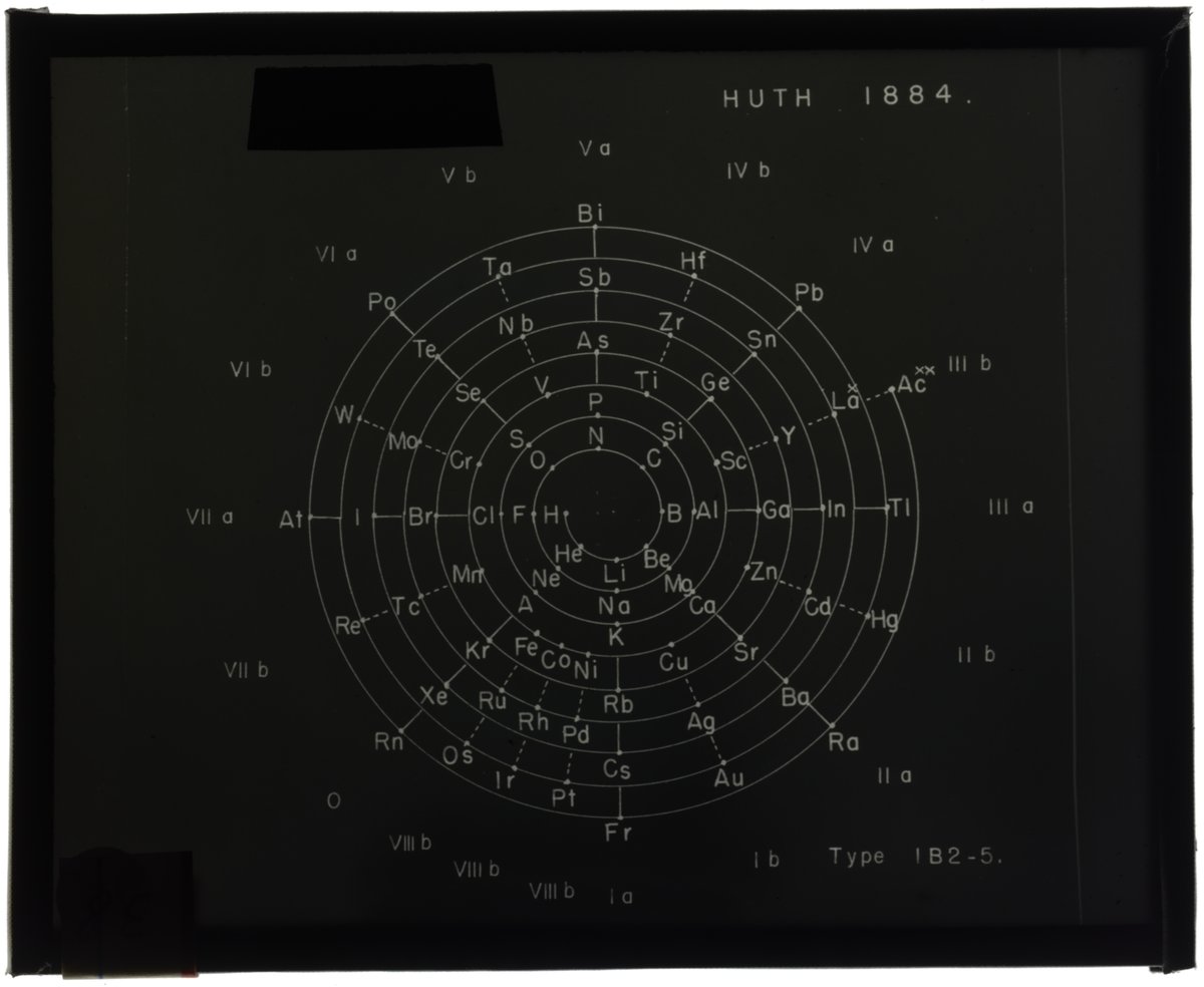 Periodic table in the style of spiral with radii (Heinrich Adolph Baumhauer, 1870)1870 (Original design), Circa 1957 (Date attributed to slide)