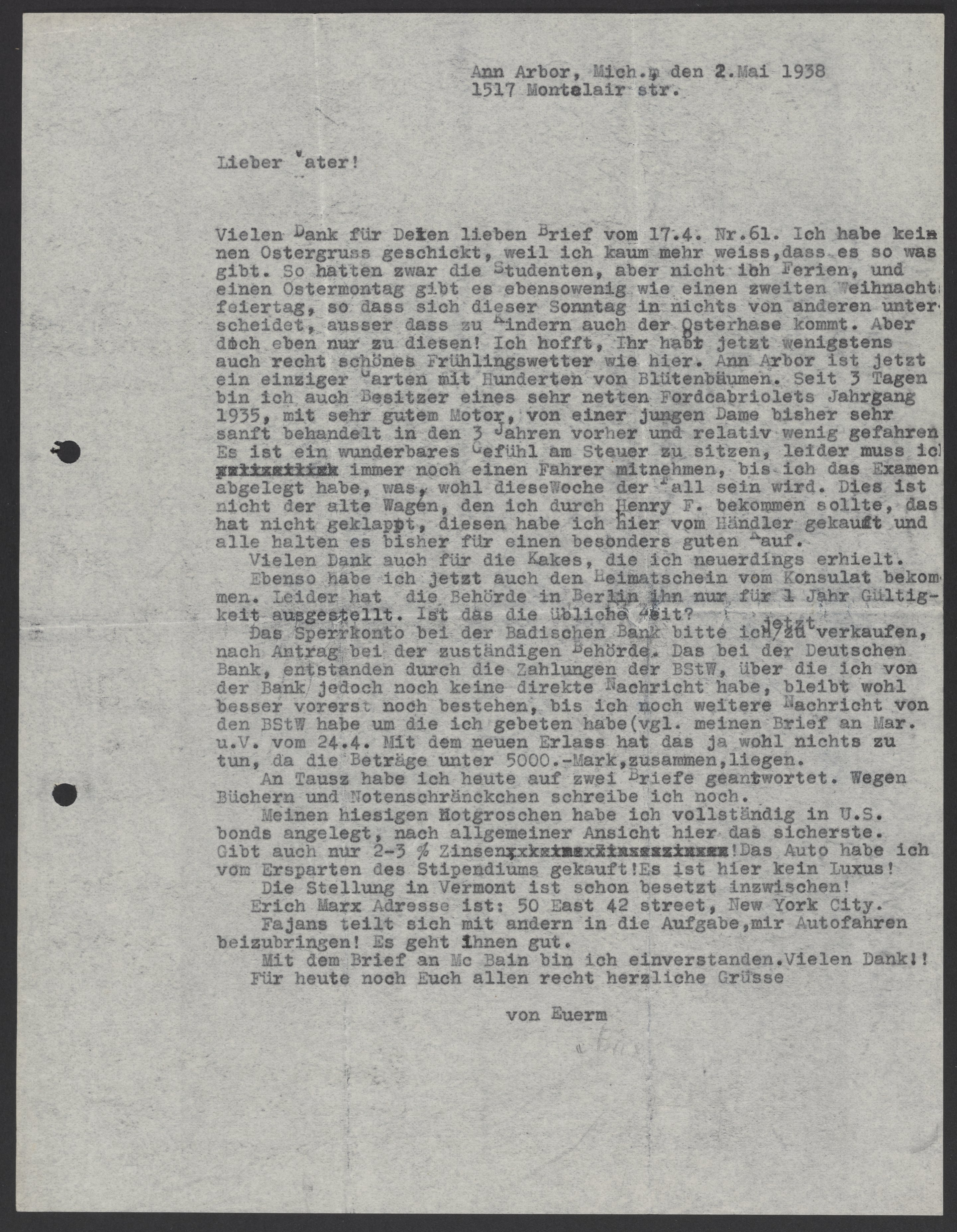 Vielen Dank für Deinen lieben Brief vom 17.4. Nr. 61. Ich habe keinen Ostergruss geschickt, weil ich kaum mehr weiss, dass es so was gibt. So hatten zwar die Studenten, aber nicht ich Ferien, und einen Ostermontag gibt es ebensowenig wie einen zweiten Weihnachtsfeitertag, so dass sich dieser Sonntag in nicht von anderen unterscheidet, ausser dass zu Kindern auch der Osterhase kommt. Aber doch eben nur zu diesen. Ich hoffe, Ihr habt jetzt wenigstens auch recht schönes Frühlingswetter wie hier. Ann Arbor ist jetzt ein einziger Garten mit Hunderten von Blütenbäumen. Seit 3 Tagen bin ich auch Besitzer eines sehr netten Fordcabriolets Jahrgang 1935, mit sehr gutem Motor, von einer jungen Dame bisher sehr sanft behandelt in den 3 Jahren vor her und relativ wenig gefahren. Es ist ein wunderbares Gefühl am Steuer zu sitzen, leider muss ich immer noch einen Fahrer mitnehmen, bis ich das Examen abgelegt habe, was, wohl diese Woche der Fall sein wird. Dies ist nicht der alte Wagen, den ich durch Henry F. bekommen sollte, das hat nicht geklappt, diesen habe hier vom Händler gekauft und alle halten es bisher für einen besonders guten Kauf.