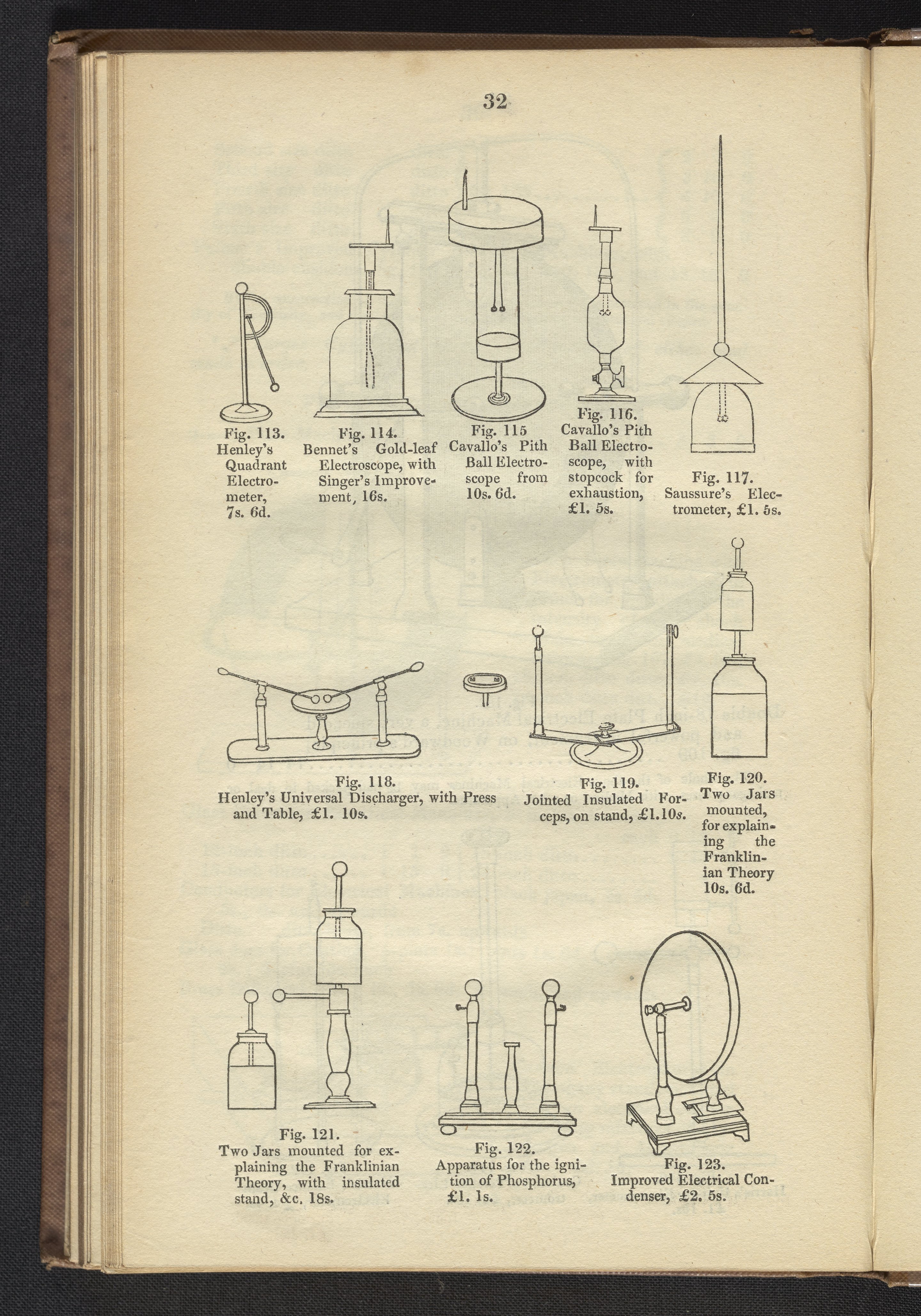 Palmer, Edward. “Figures 113-123. Plate Electrical Machines.” In Palmer's New Catalogue, with Three Hundred Engravings of Apparatus, Illustrative of Chemistry, Pneumatics, Frictional and Voltaic Electricity, Electro Magnetism, Optics, &c. London, England: William Gilbert, 1840. https://digital.sciencehistory.org/works/9hu7g0h.