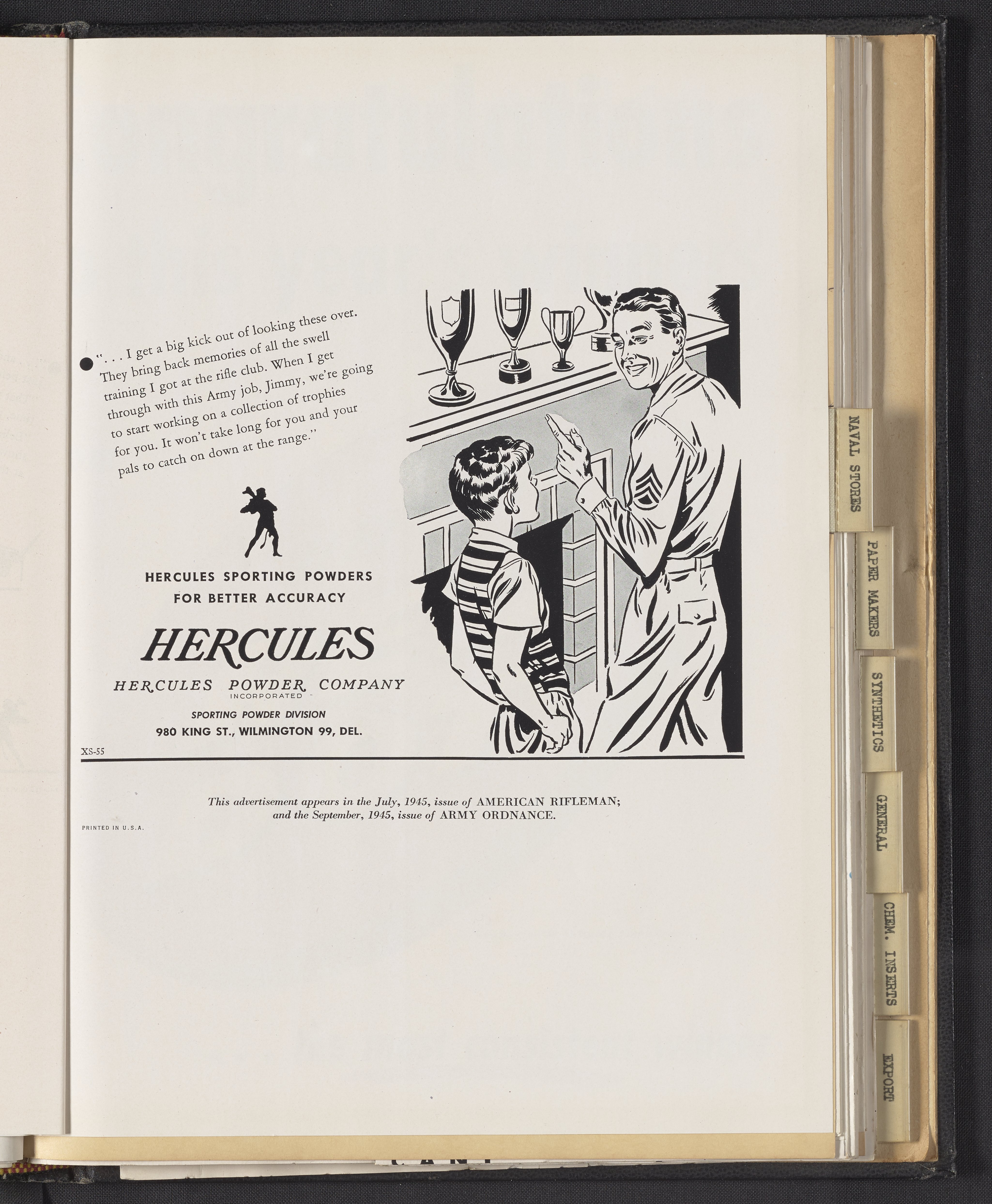 Hercules Incorporated. “Advertisement for Hercules Sporting Powders.” 1945 Hercules Advertisements, 1945. Records of Hercules Incorporated, Volume 1945. Science History Institute. Philadelphia. https://digital.sciencehistory.org/works/9k41zf198.