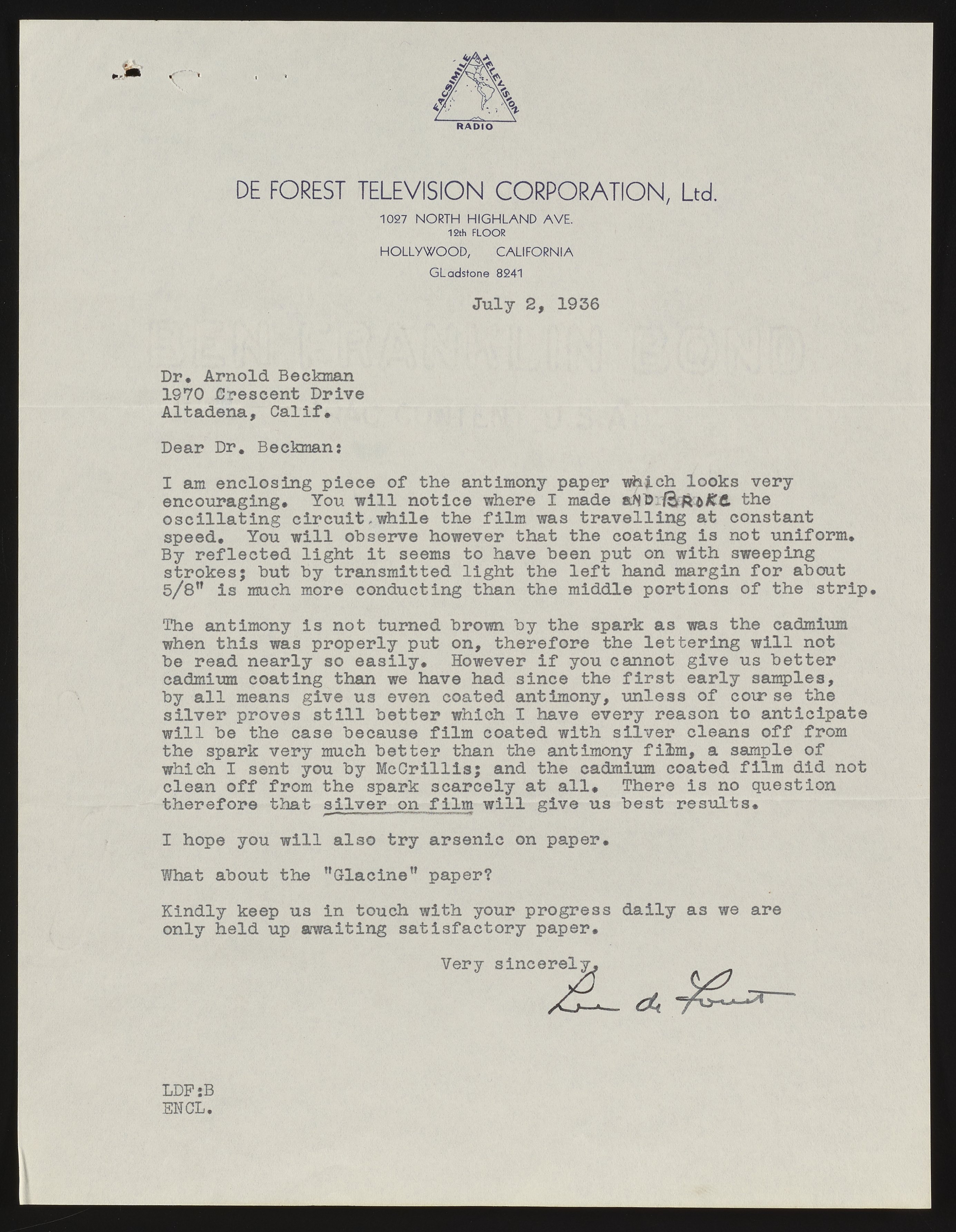 Letter from Lee de Forest to Arnold O. Beckman