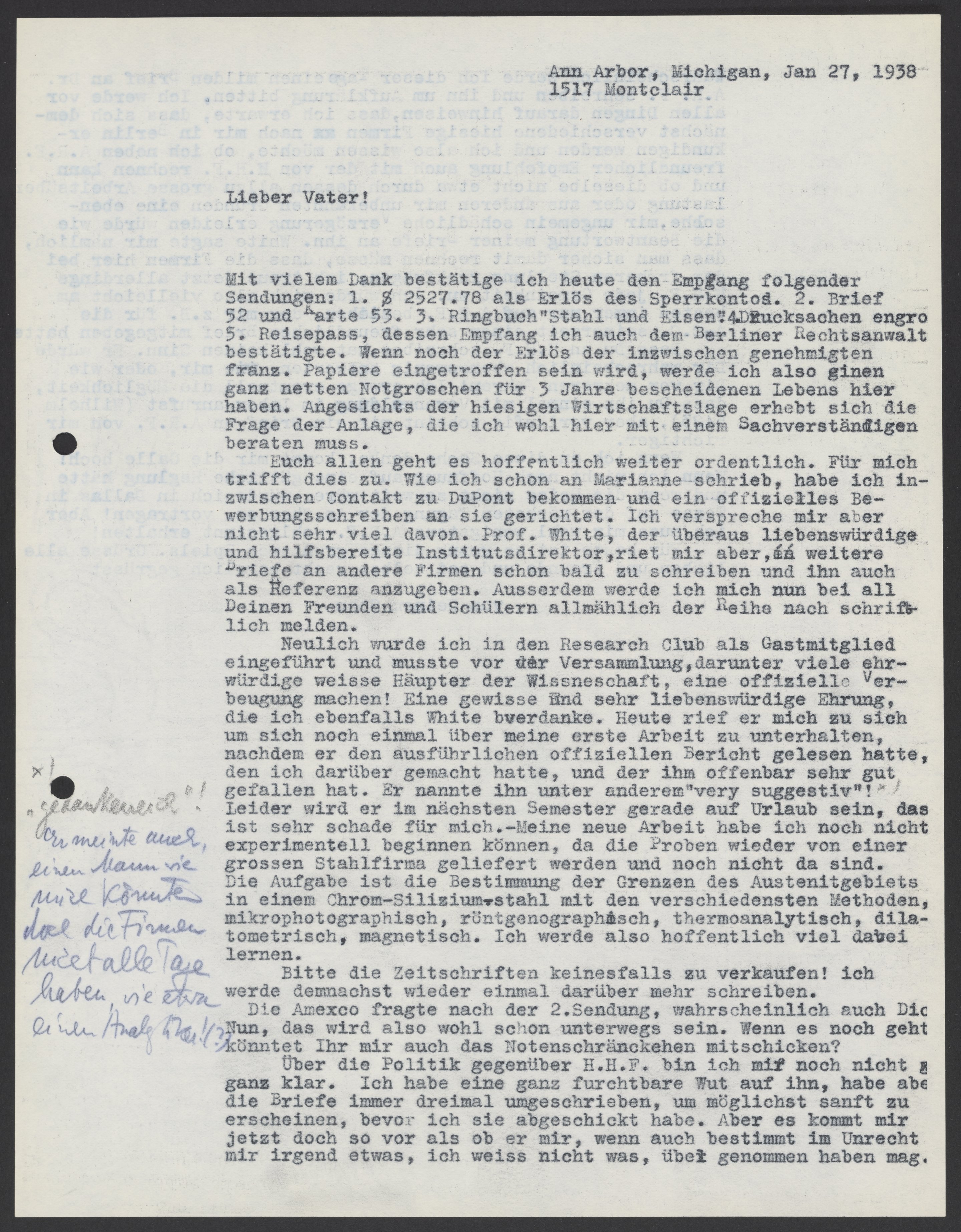 Mit vielen Dank bestätige ich heute den Empfang folgender Sendungen: 1. $2527.78 als Erlös des Sperrkontos 2. Brief 52 und Karte 53. 3. Ringbuch "Stahl und Eisen." 4. Drucksachen engro 5. Reisepass. dessen Empfang ich auch dem Berliner Rechtsanwalt bestätigte. Wenn noch der Erlös der inzwischen genehmigten franz. Papiere eingetroffen sein wird, werde ich also einen ganz netten Notgroschen für 3 Jahre bescheidenen Lebens hier haben. Angesichts der hiesigen Wirtschaftslage erhebt sich die Frage der Anlage, die ich wohl hier mit einem Sachverständigen beraten muss.