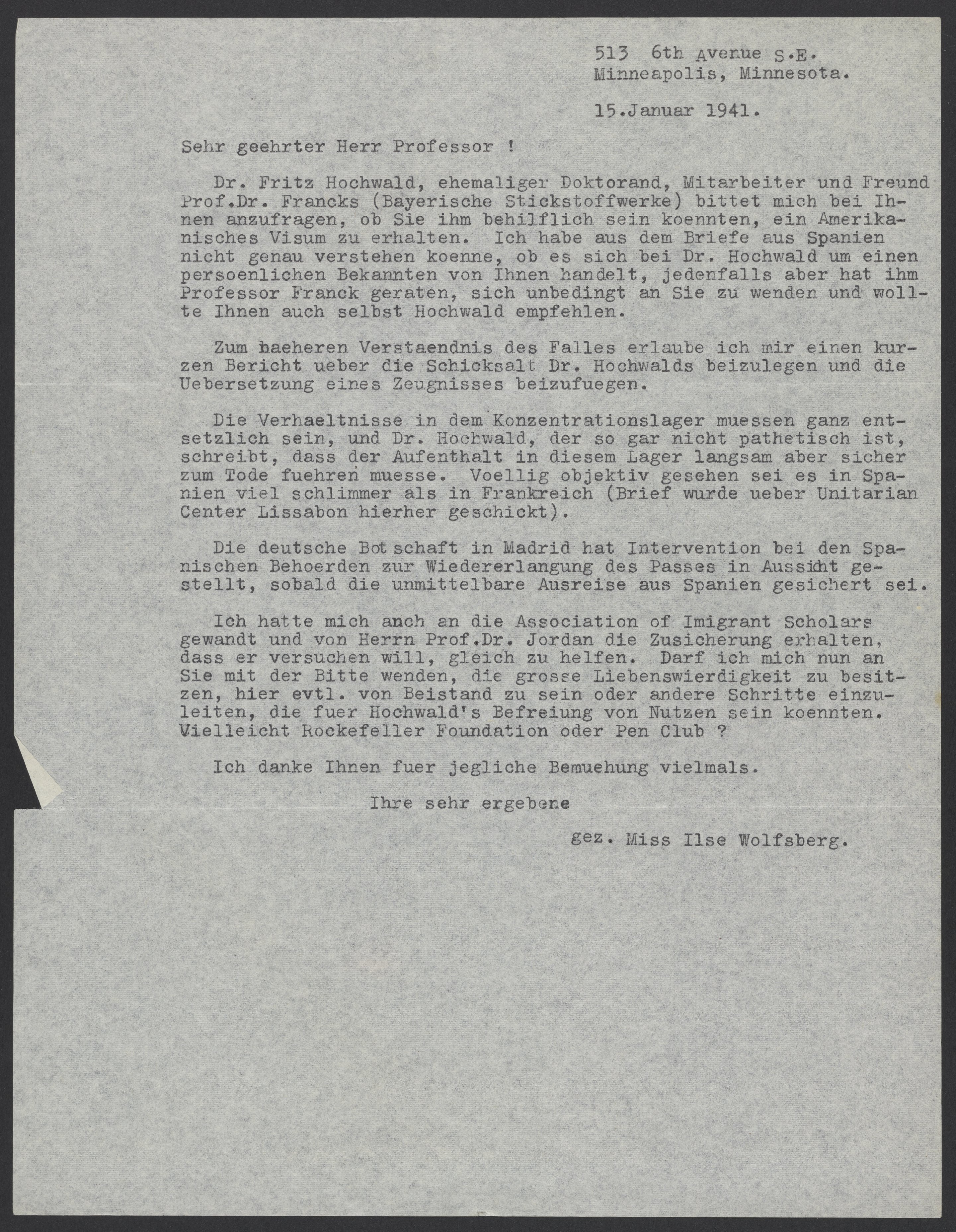 Dr. Fritz Hochwalds, ehemaliger Doktorand, Mitarbeiter und Freund Prof. Dr. Francks (Bayerischer Stickstoffwerke) bittet mir bei Ihnen anzufragen, ob Sie ihm behilflich sein könnten, ein Amerikanisches Visum zu erhalten. Ich habe aus dem Briefe aus Spanien nicht genau verstehen können, ob es sich bei Dr. Hochwald um einen persönlichen Bekannten von Ihnen handelt, jedenfalls aber hat ihm Professor Franck geraten, sich unbedingt an Sie zu wenden und wollte Ihnen auch selbst Hochwald empfehlen. Zum näheren Verständnis des Falles erlaube ich mir einen kurzen Bericht über die Schicksale Dr. Hochwalds beizulegen und die Übersetzung eines Zeugnisses beizufügen.