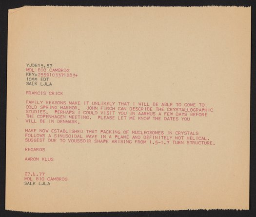 Klug, A. (Aaron), Sir. “Letter from Aaron Klug to Francis Crick, April 27, 1977,” April 27, 1977. History of Molecular Biology Collection, Box 20, Folder 1. Science History Institute. Philadelphia. https://digital.sciencehistory.org/works/9lnt6tv.