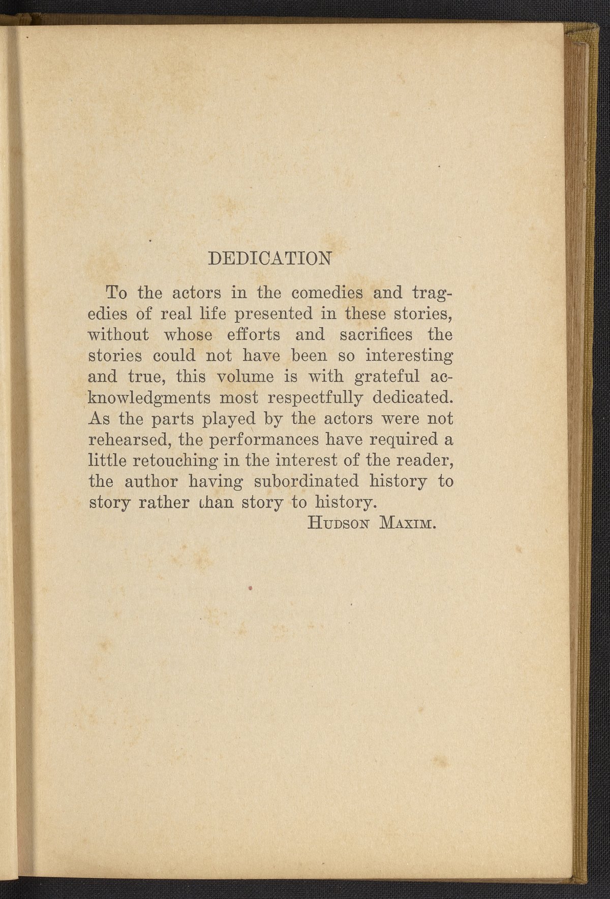 Small JPG1200 x 1672px — 443 KBFull-sized JPG2277 x 3173px — 1.4 MBOriginal fileTIFF — 2277 x 3173px — 20.7 MBHudson Maxim (1853-1927), was a U.S. inventor and chemist who invented a variety of explosives, including smokeless gunpowder. His autobiographical work begins with an introduction to explosives, a discussion of the differentiating factors between types of explosives, and a brief history of the use of explosives in war. The rest of the work contains a number of brief anecdotes about Maxim's experiences with explosives throughout his life and career. Many of these anecdotes include outdated and offensive language to describe the race and gender of the individuals discussed. Some of these stories also contain graphic descriptions of injuries and death due to explosives.