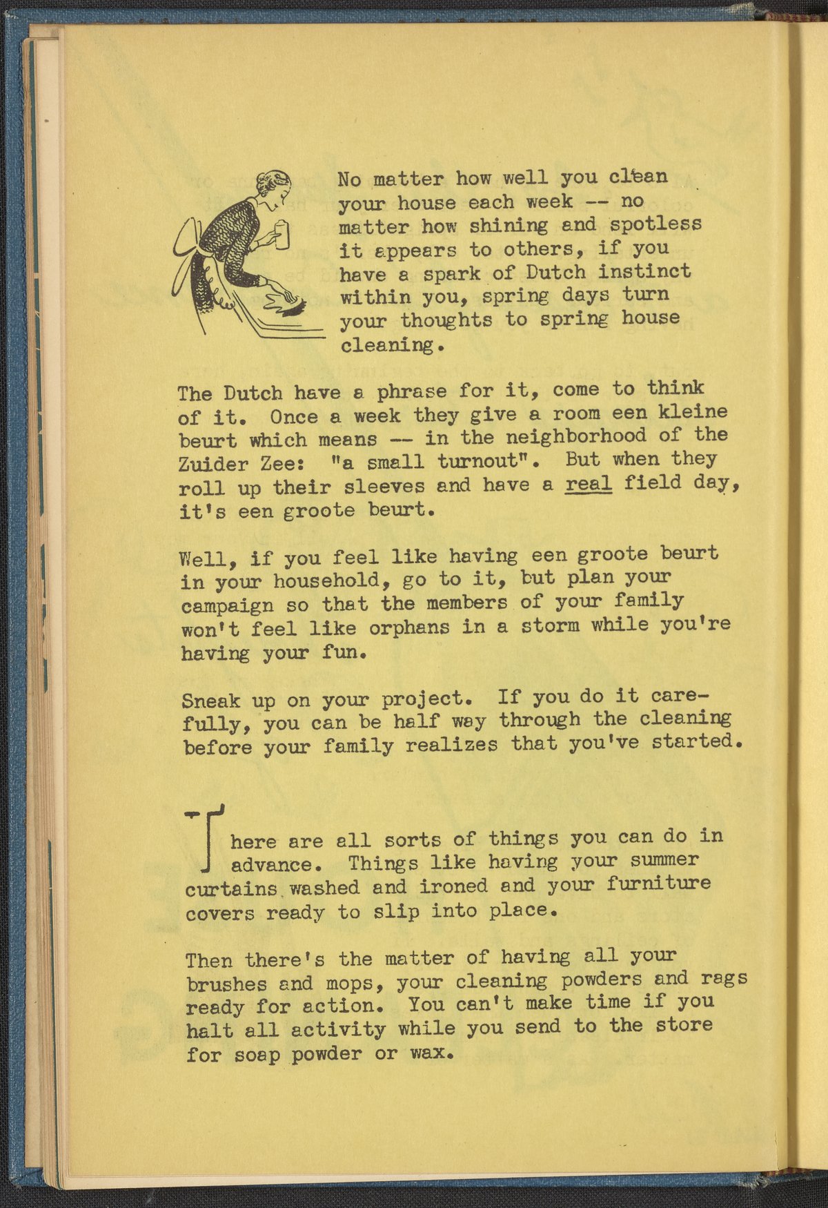 Booklet corresponding to a radio broadcast program created by the National Paint, Varnish, and Lacquer Association. The booklet describes how to prepare for spring cleaning including laundering summer curtains, organizing cleaning supplies, and ordering new floor wax and furniture polish. Also discusses how to budget for spring redecoration. Then, provides instruction for getting started including how to treat floors, rugs, furniture, enameled surfaces, etc. Includes small stylized illustrations throughout and decorated covers.