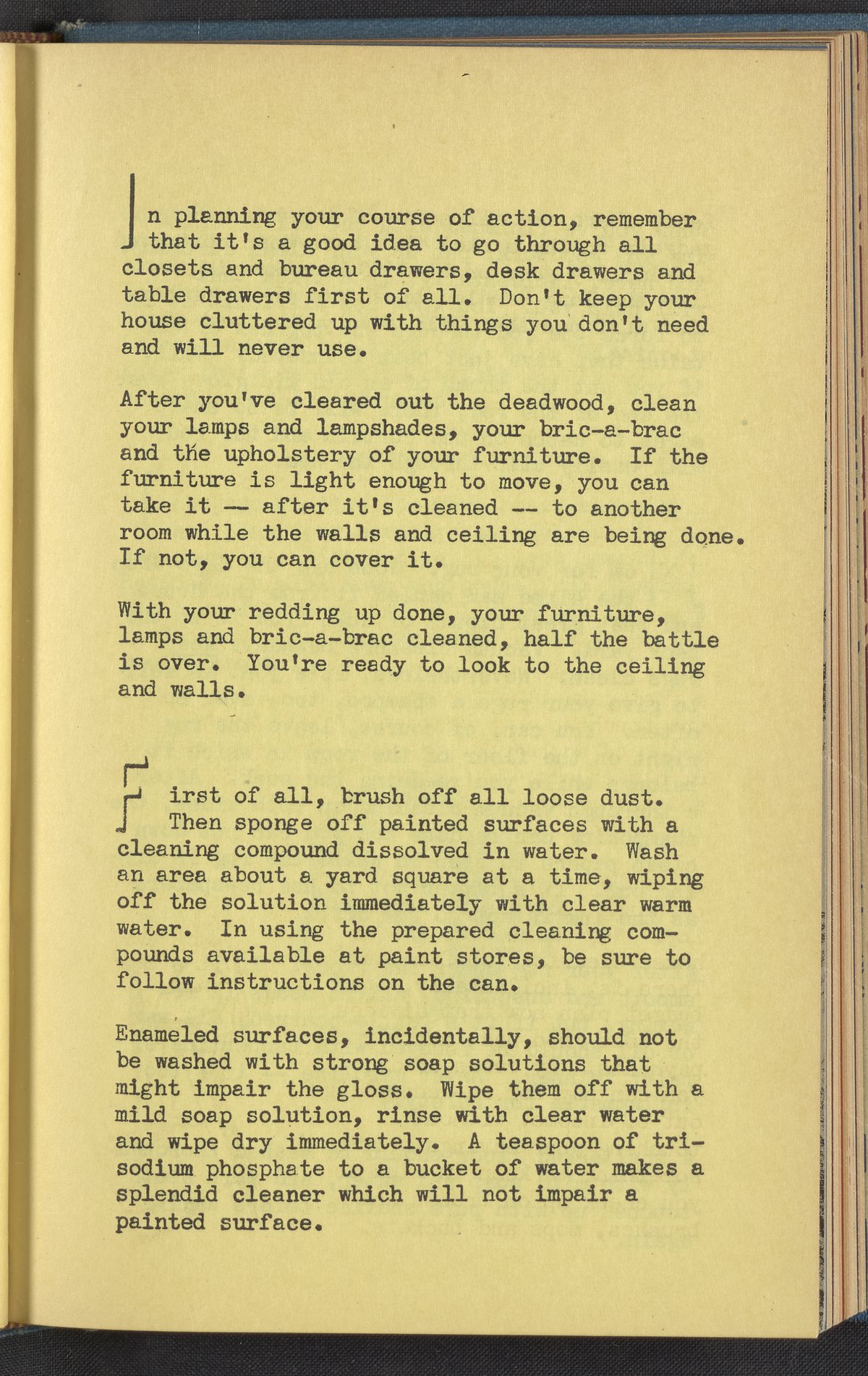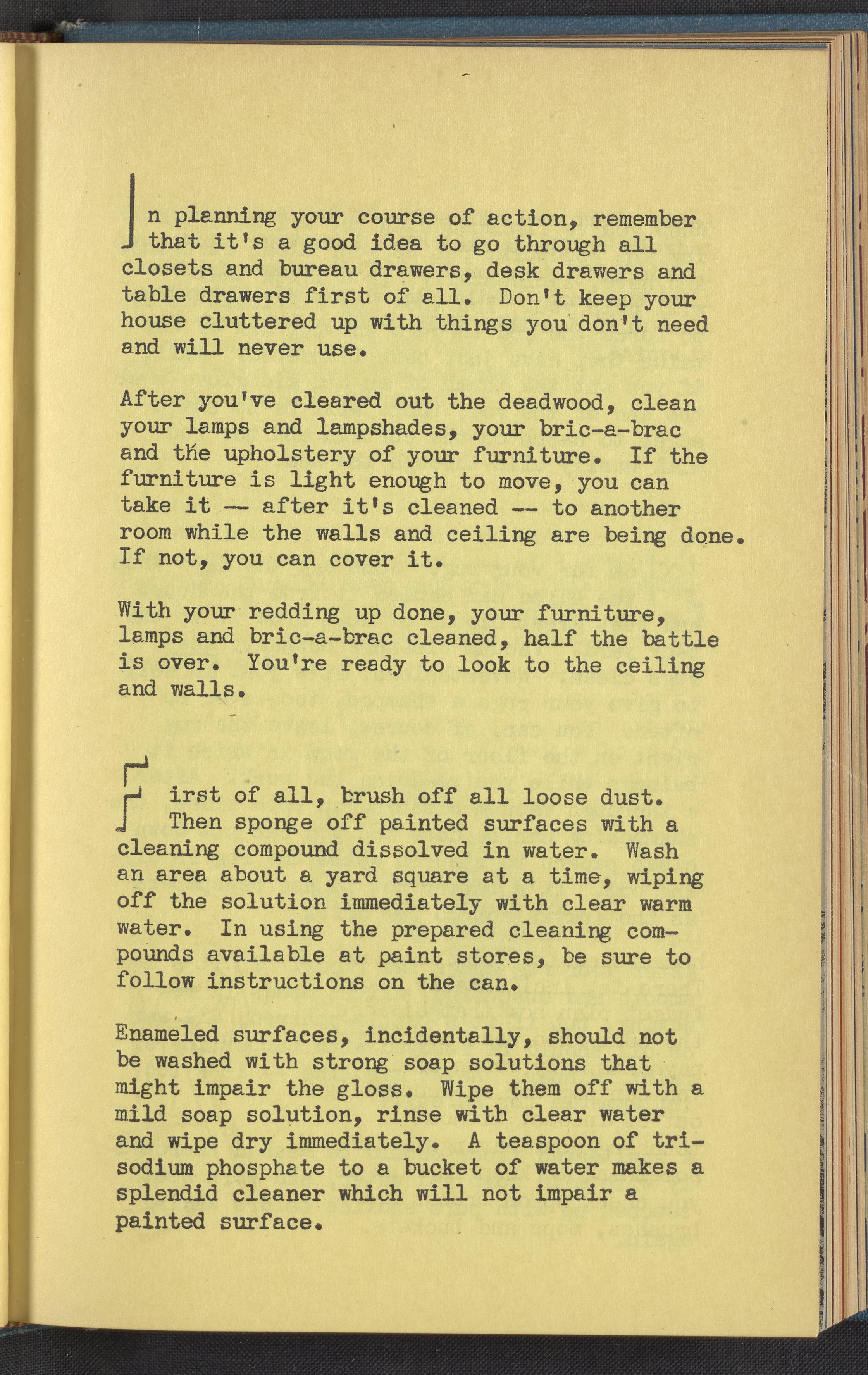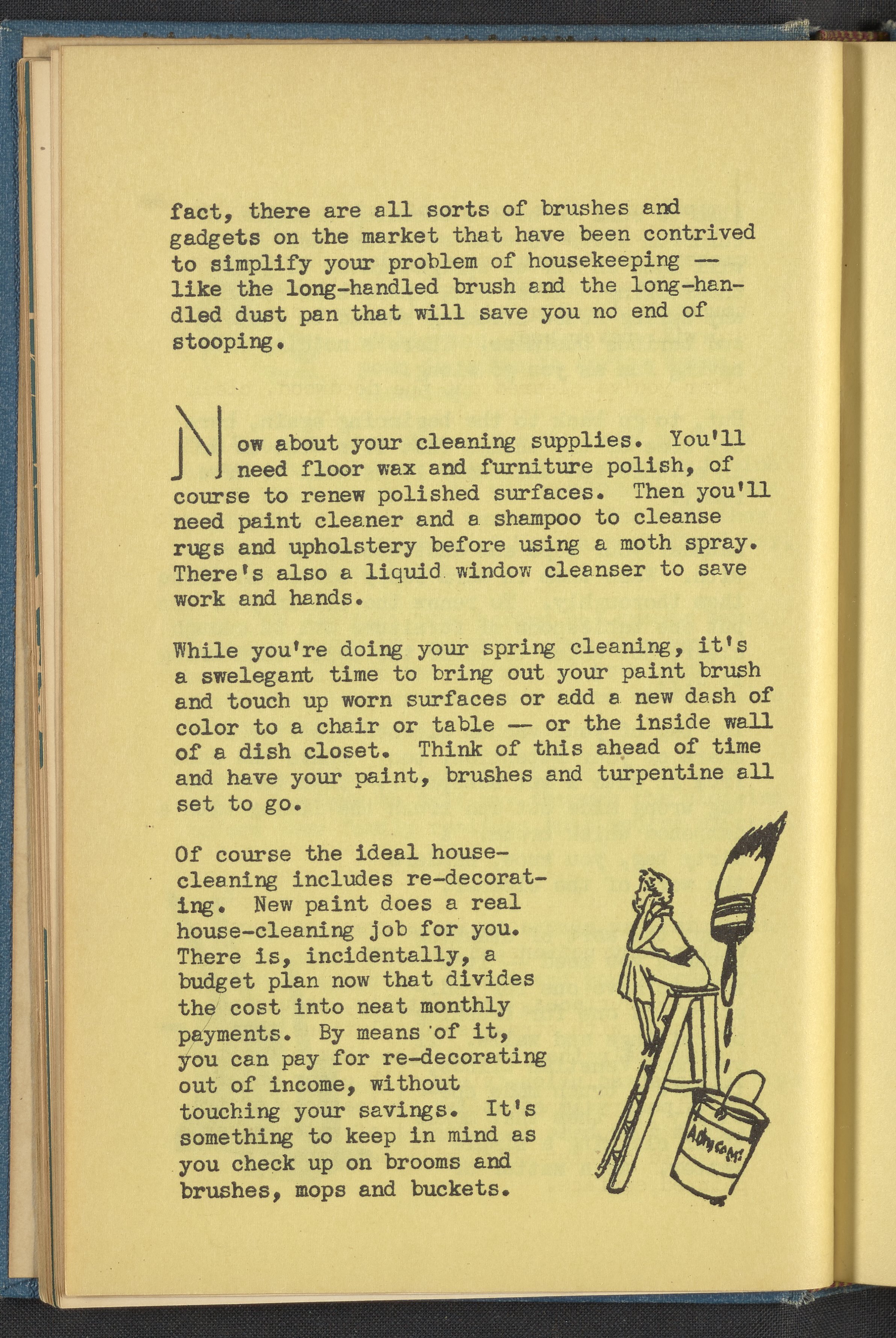 Booklet corresponding to a radio broadcast program created by the National Paint, Varnish, and Lacquer Association. The booklet describes how to prepare for spring cleaning including laundering summer curtains, organizing cleaning supplies, and ordering new floor wax and furniture polish. Also discusses how to budget for spring redecoration. Then, provides instruction for getting started including how to treat floors, rugs, furniture, enameled surfaces, etc. Includes small stylized illustrations throughout and decorated covers.
