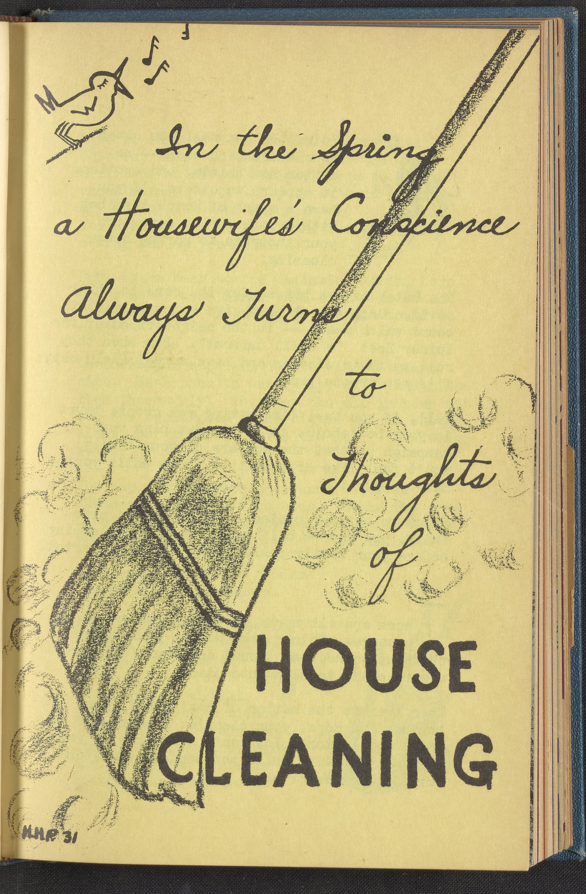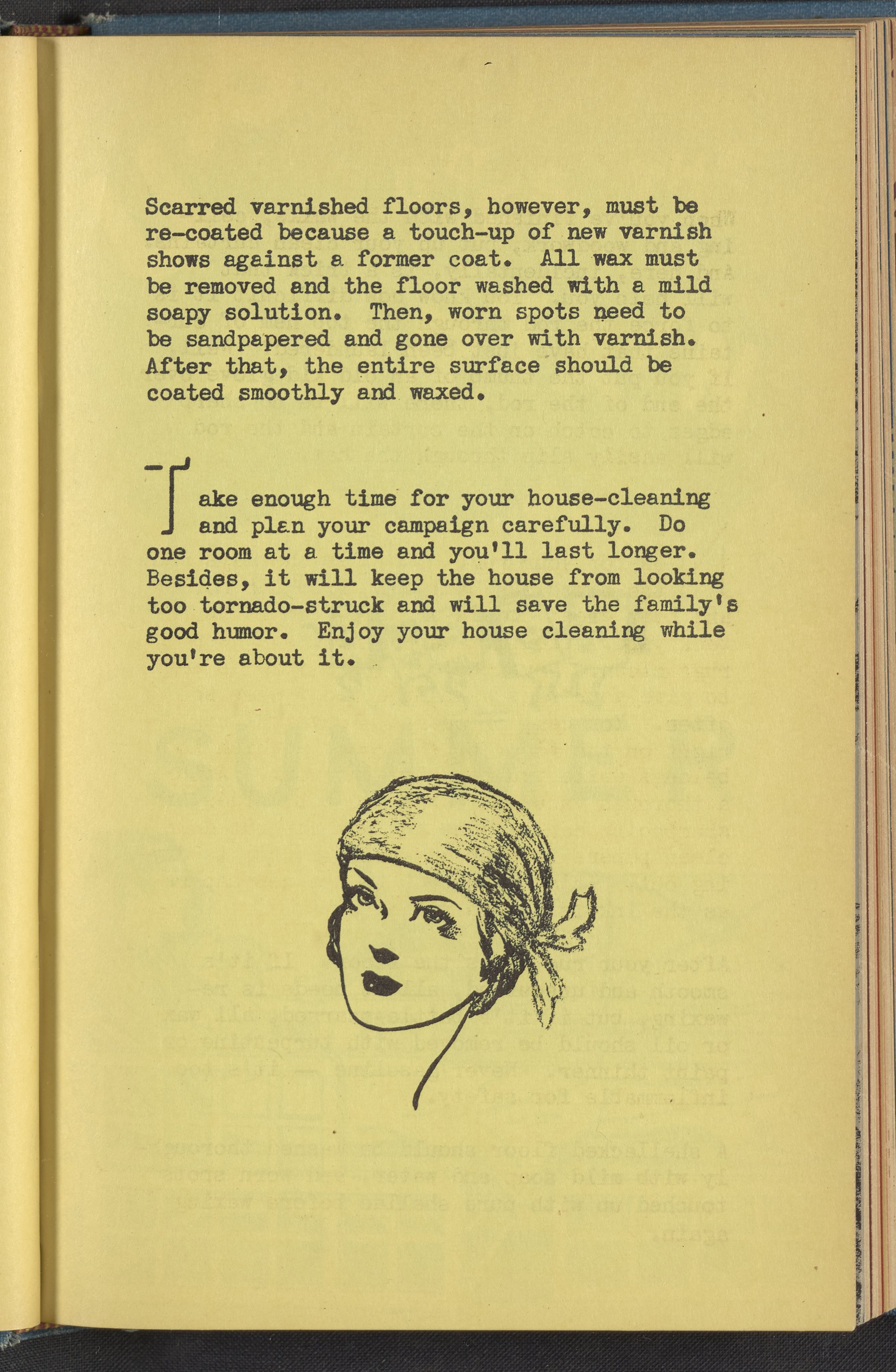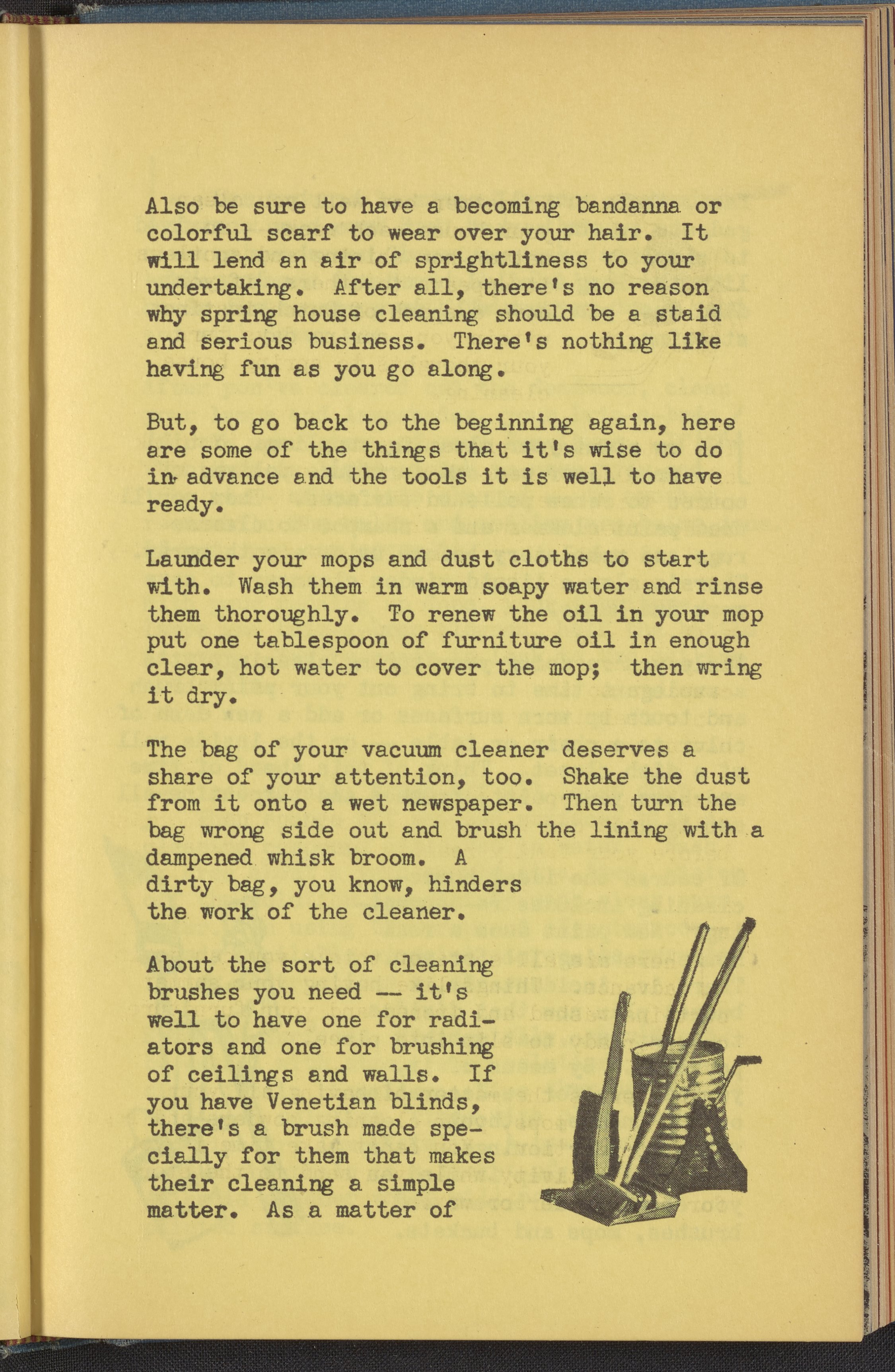 Booklet corresponding to a radio broadcast program created by the National Paint, Varnish, and Lacquer Association. The booklet describes how to prepare for spring cleaning including laundering summer curtains, organizing cleaning supplies, and ordering new floor wax and furniture polish. Also discusses how to budget for spring redecoration. Then, provides instruction for getting started including how to treat floors, rugs, furniture, enameled surfaces, etc. Includes small stylized illustrations throughout and decorated covers.