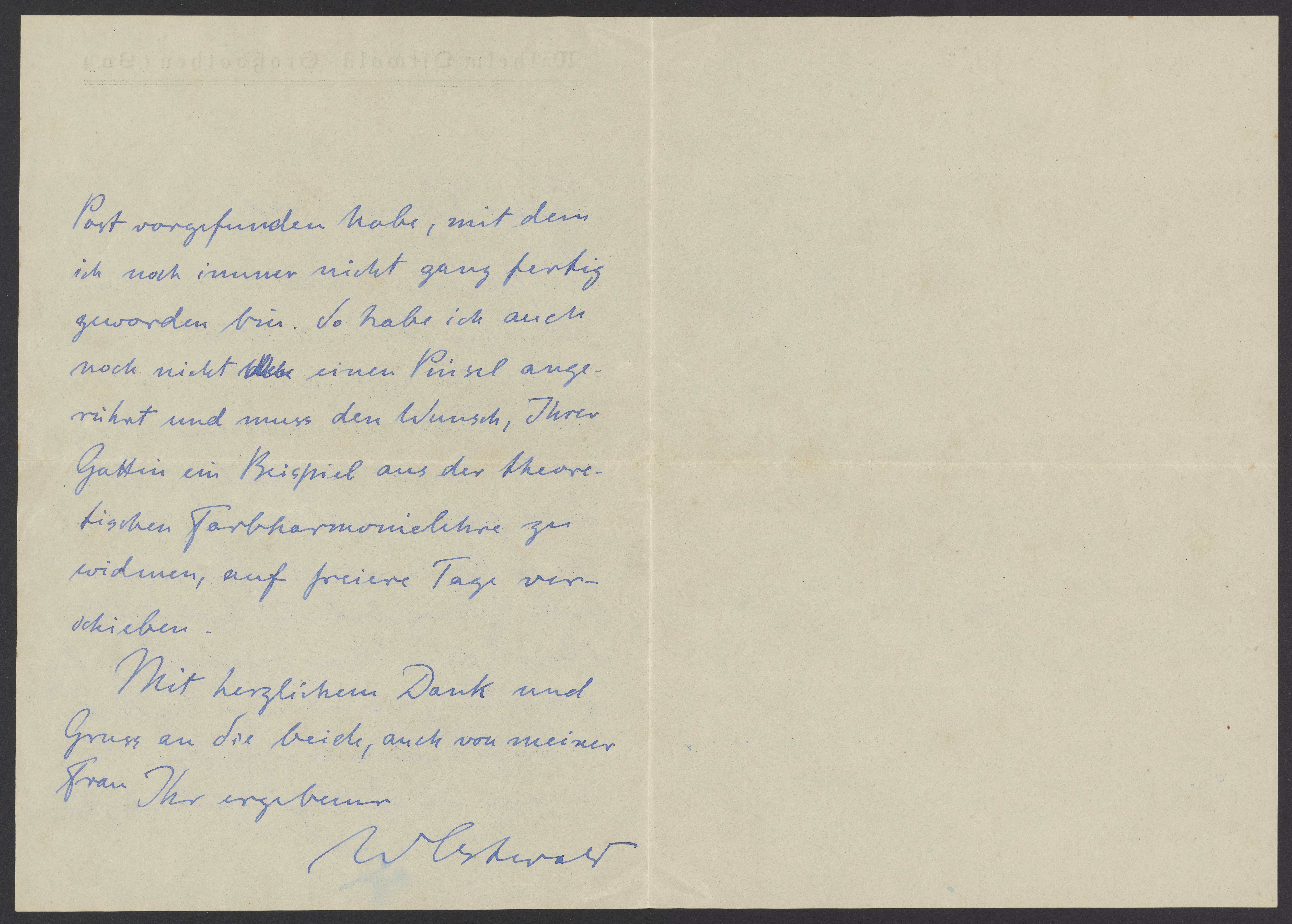 Small JPG1200 x 884px — 155 KBLarge JPG2880 x 2123px — 872 KBFull-sized JPG4198 x 3094px — 1.7 MBOriginal fileTIFF — 4198 x 3094px — 37.2 MBLetter from Wilhelm Ostwald (1853-1932) to Georg Bredig (1868-1944). Ostwald thanks Bredig for a previous celebration and mentions his work Theory of Color Harmony.