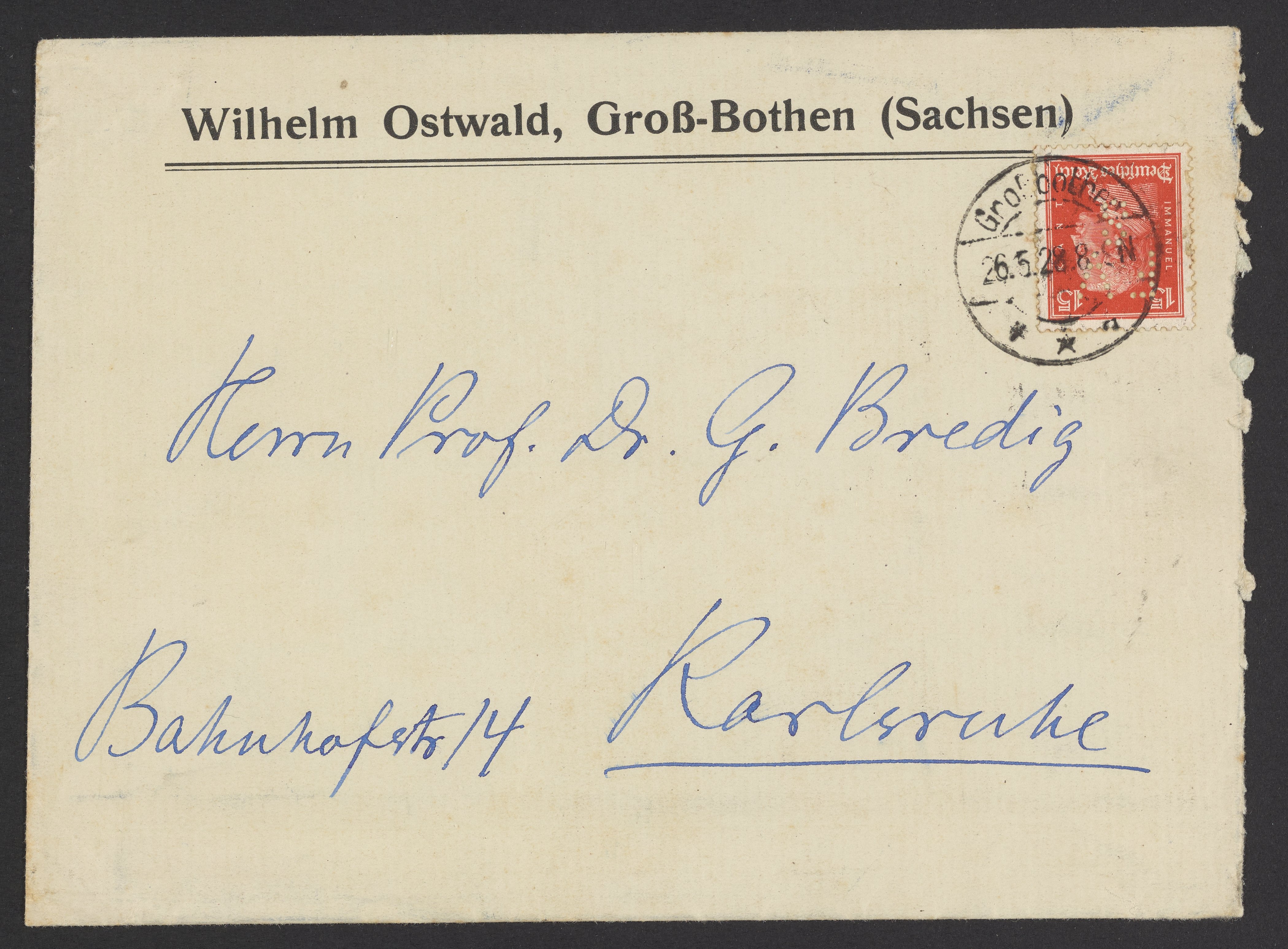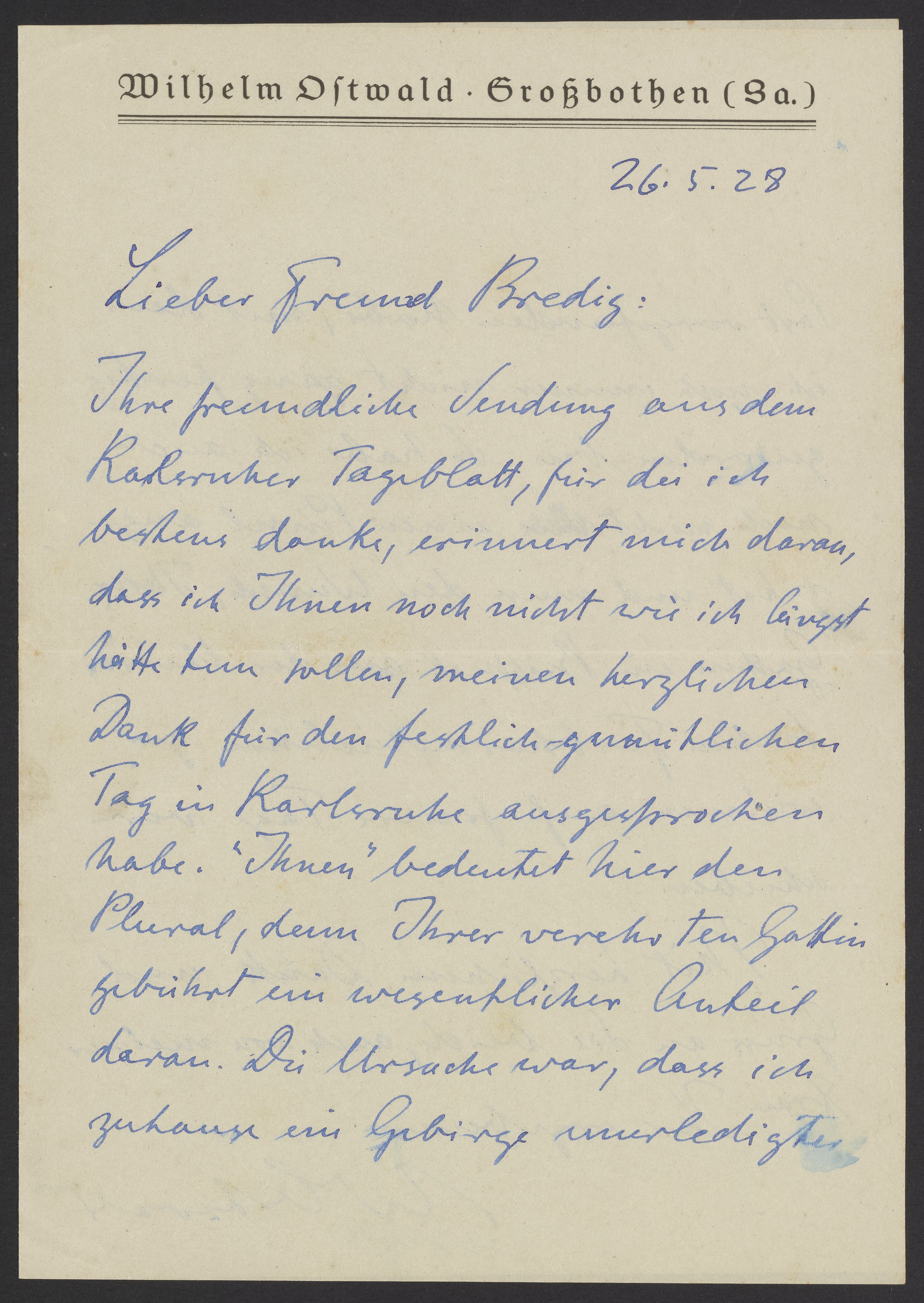 Ostwald, Wilhelm. “Letter from Wilhelm Ostwald to Georg Bredig, May 1928,” May 26, 1928. Papers of Georg and Max Bredig, Box 2, Folder 33. Science History Institute. Philadelphia. https://digital.sciencehistory.org/works/9o2ob53.