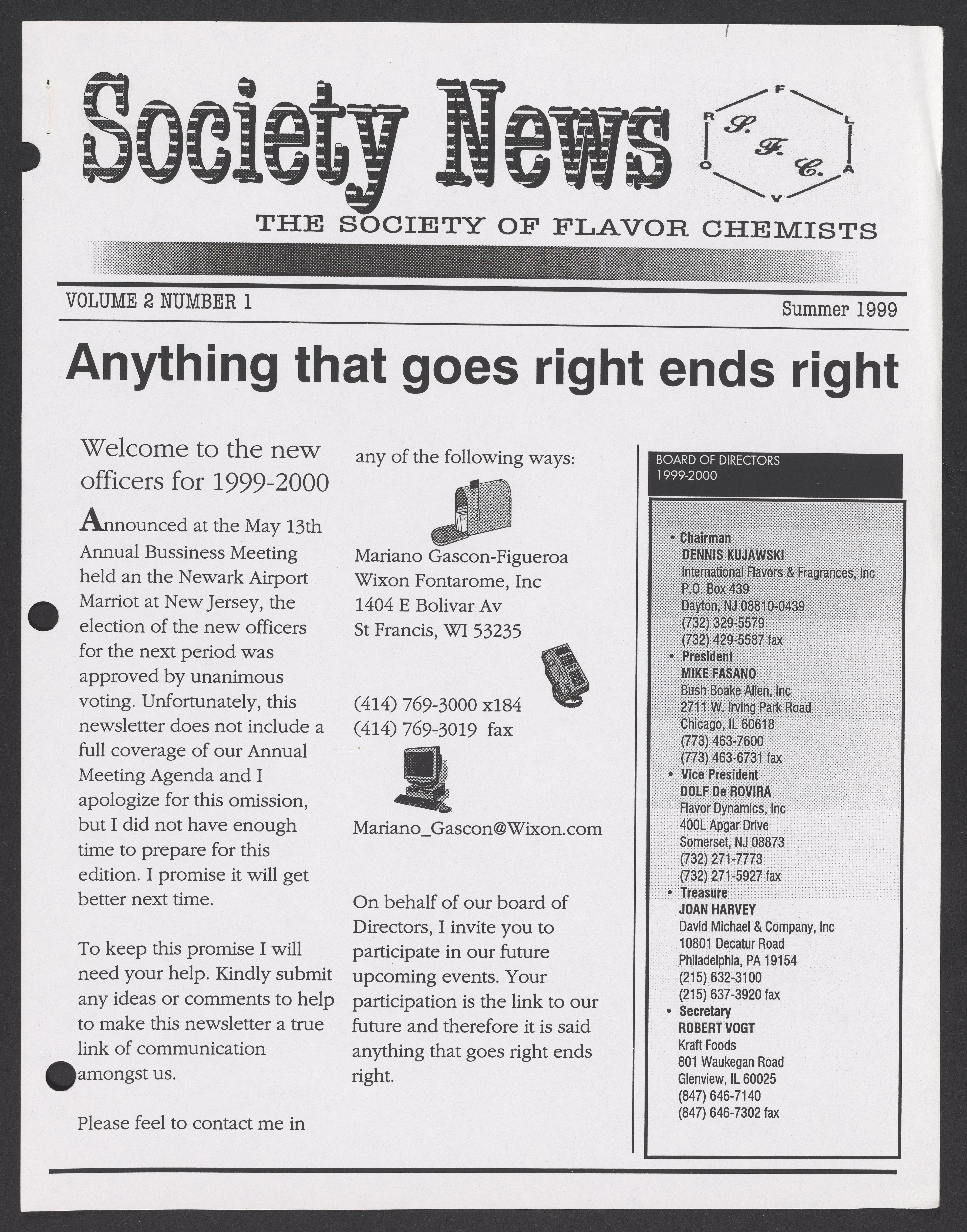 Society of Flavor Chemists. “Society News, Volume 2, Issue 1,” 1999. Society of Flavor Chemists, Society News, Box 1, Folder 2. Science History Institute. Philadelphia. https://digital.sciencehistory.org/works/9o49g72.