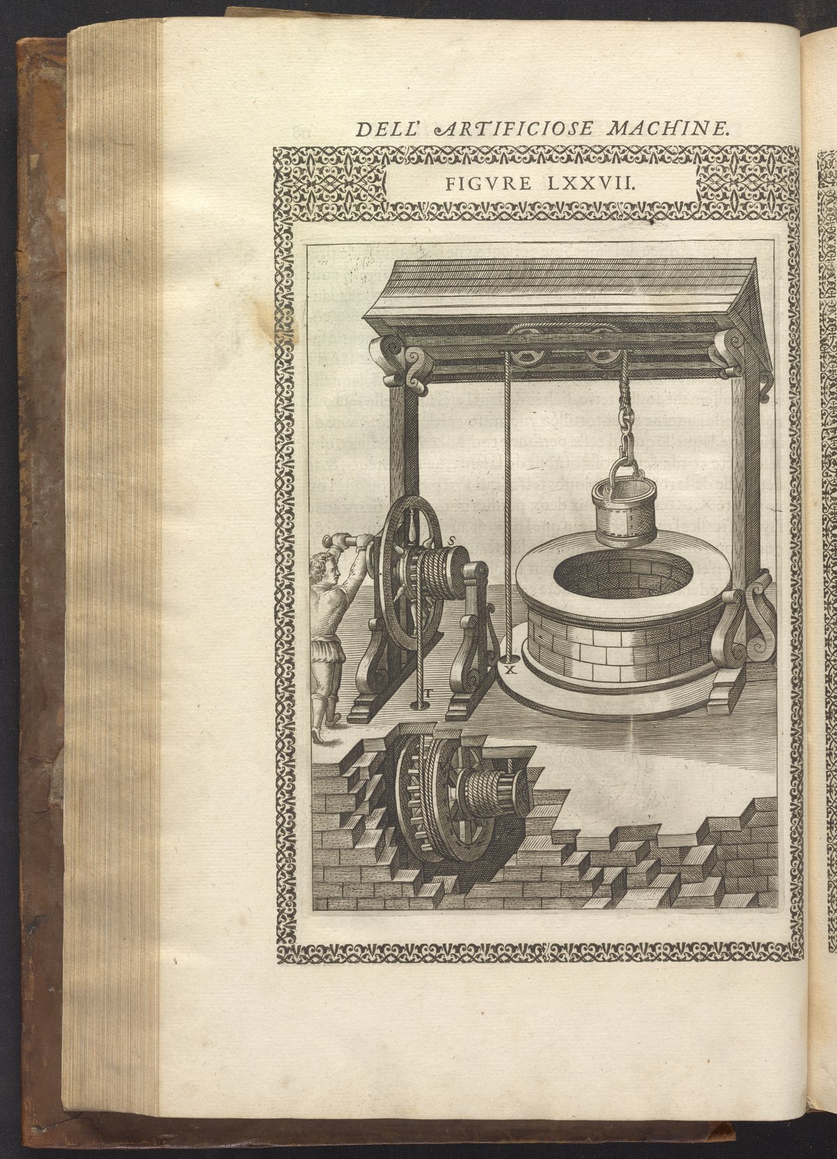 Ramelli, Agostino. “Plate 77: Single-Person-Operated Device for Drawing Water from a Very Deep Well.” In Le Diverse Et Artificiose Machine Del Capitano Agostino Ramelli. Paris, France, 1588. https://digital.sciencehistory.org/works/9p290958d.