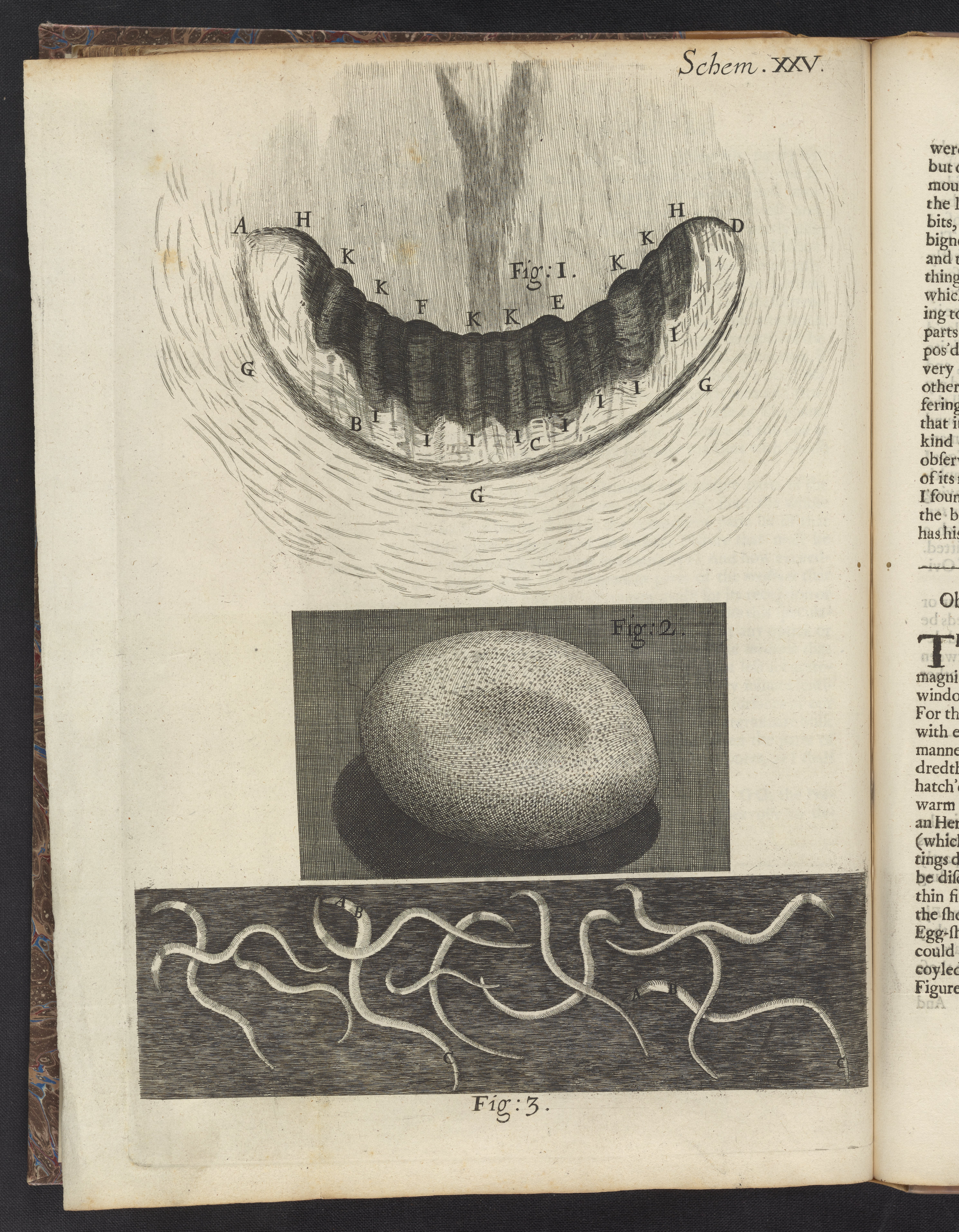 Engravings from Schem. 25 of the first edition of Robert Hooke's seminal volume, Micrographia : or, Some physiological descriptions of minute bodies made by magnifying glasses. With observations and inquiries thereupon. Figure 1 depicts the teeth of a snail. Figure 2 depicts the egg of a silkworm. Figure 3 depicts small eels in vinegar, as described in Observ. LVII.
