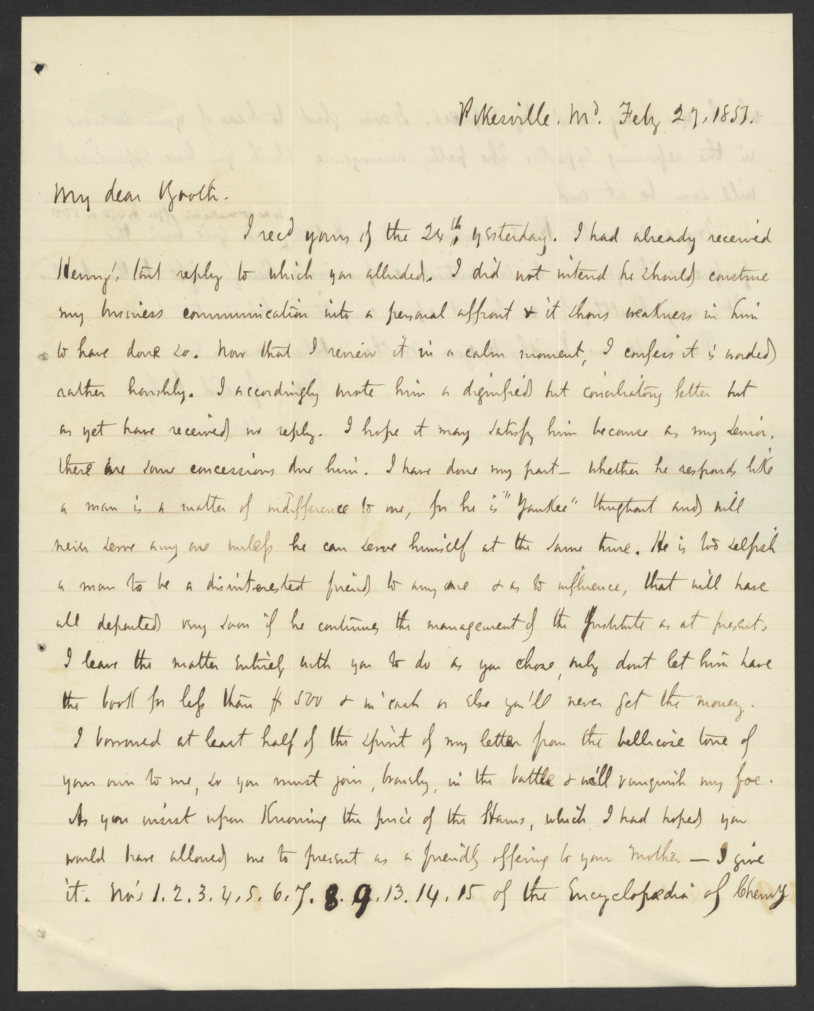 Small JPG1200 x 1490px — 243 KBFull-sized JPG2739 x 3402px — 883 KBOriginal fileTIFF — 2739 x 3402px — 26.7 MBCampbell Morfit (1820-1897), a distinguished chemist and co-editor with James Curtis Booth (1810-1888) of the Encyclopedia of Chemistry (1850), writes to Booth concerning Professor Joseph Henry (1797-1878), first Secretary of the Smithsonian Institution. Morfit discusses Henry's rebuke of him as reported in his letter of February 18 and Morfit’s reactions to it.
