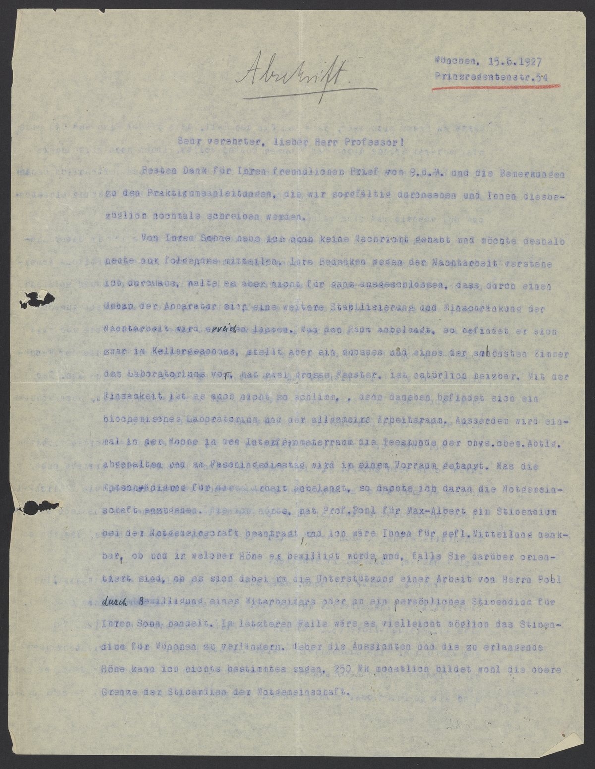 Letter from Kasimir Fajans to Georg Bredig, June 15, 1927