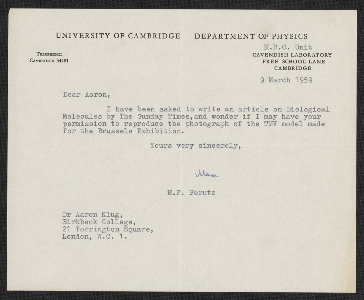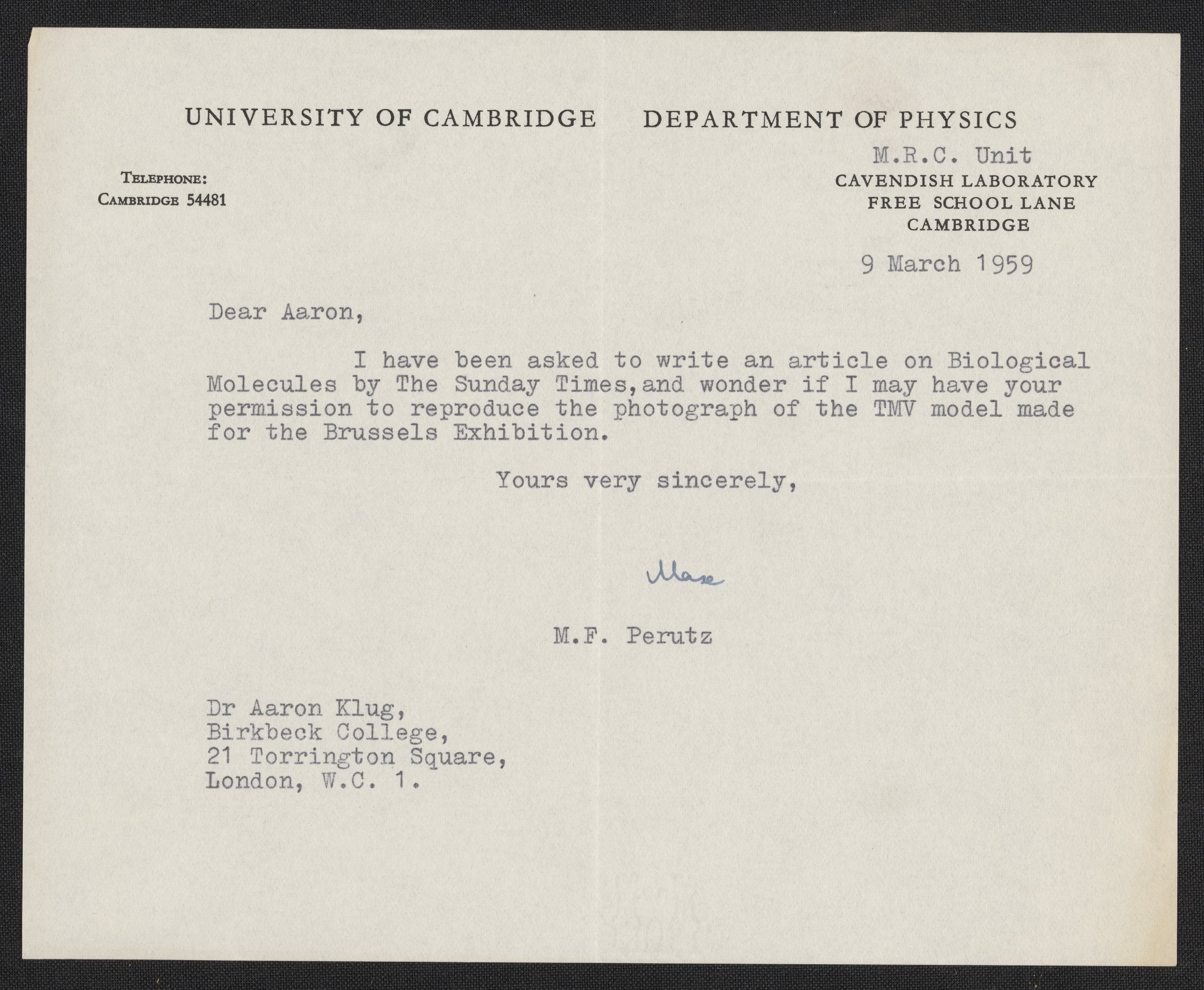 Max Perutz (1914-2002) asks Aaron Klug (1926-2018) if he can use an image of his tobacco mosaic virus model (TMV) in an upcoming article to be published in The Sunday Times.