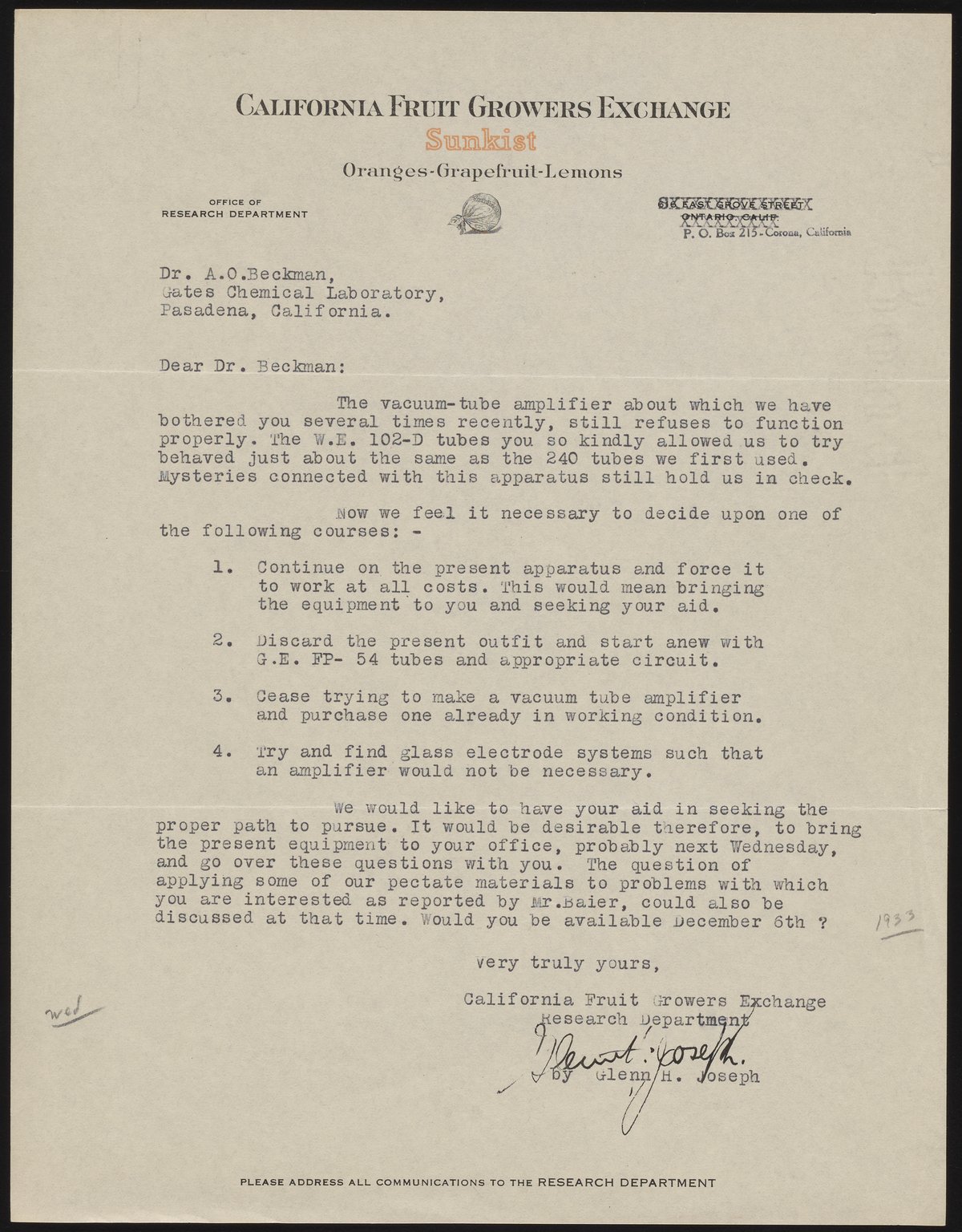 Joseph, Glenn. “Letter from Glenn Joseph to Arnold O. Beckman,” 1933. Beckman Historical Collection, Box 14, Folder 8. Science History Institute. Philadelphia. https://digital.sciencehistory.org/works/9s161618p.