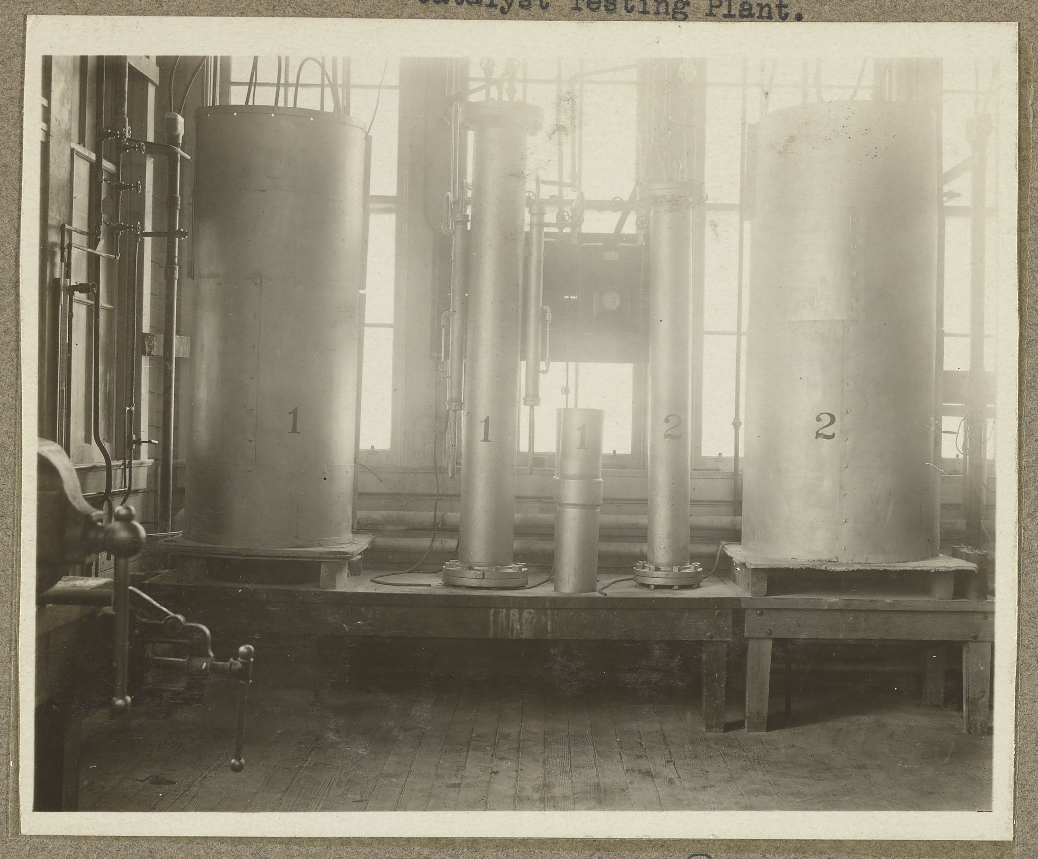 “Crackers, Deoxidizers, and Scrubbers at Catalyst Testing Plant,” circa 1928. Travis P. Hignett Collection of Fixed Nitrogen Research Laboratory Photographs, Box 1. Science History Institute. Philadelphia. https://digital.sciencehistory.org/works/9s161626c.