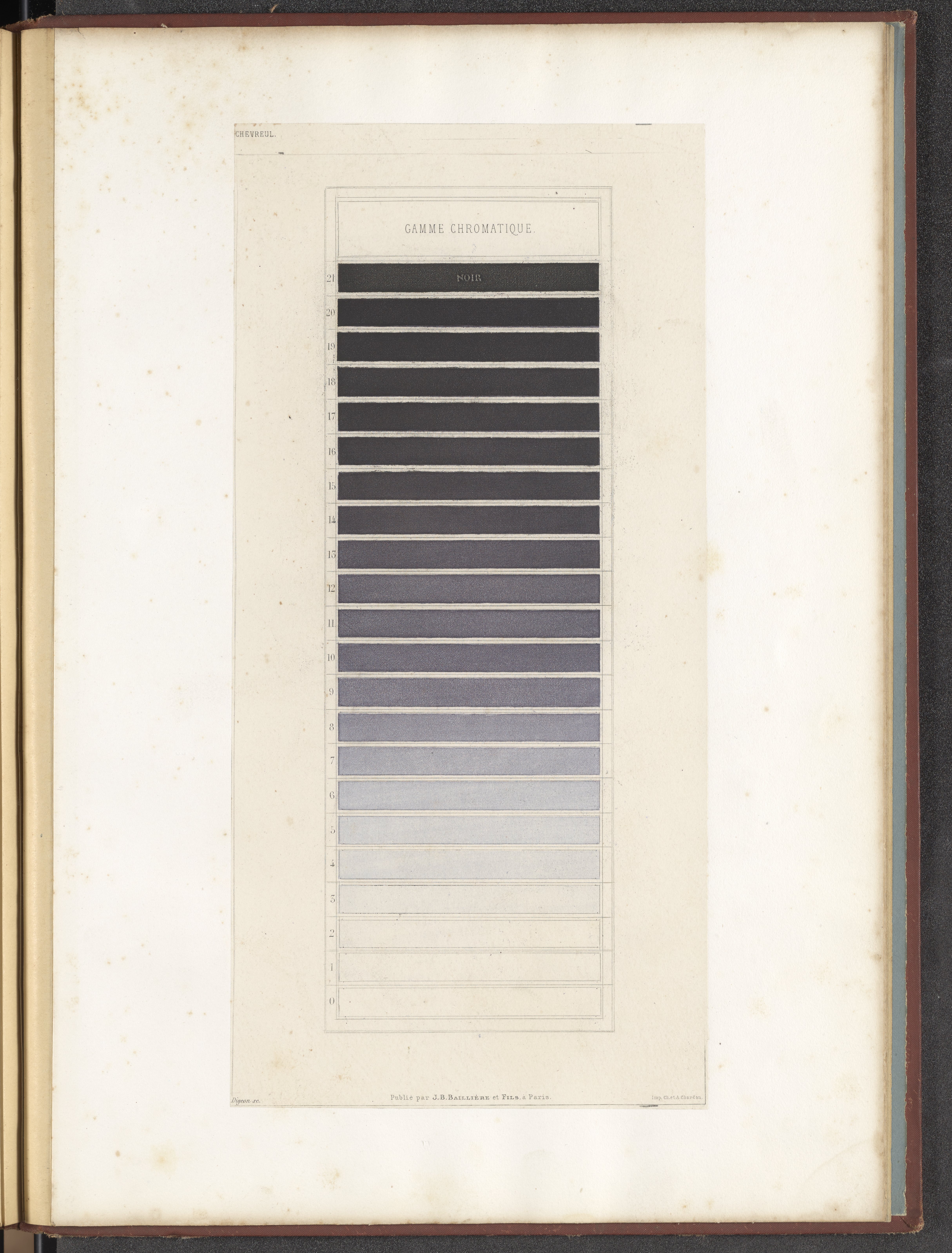 Chevreul, M. E. (Michel Eugène). “Plate XXV: Gamme Chromatique: Bleu-Violet.” In Des Couleurs Et De Leurs Applications Aux Arts Industriels à l'Aide Des Cercles Chromatiques. Paris, France: J.-B. Baillière et fils, 1864. https://digital.sciencehistory.org/works/9s1616406.