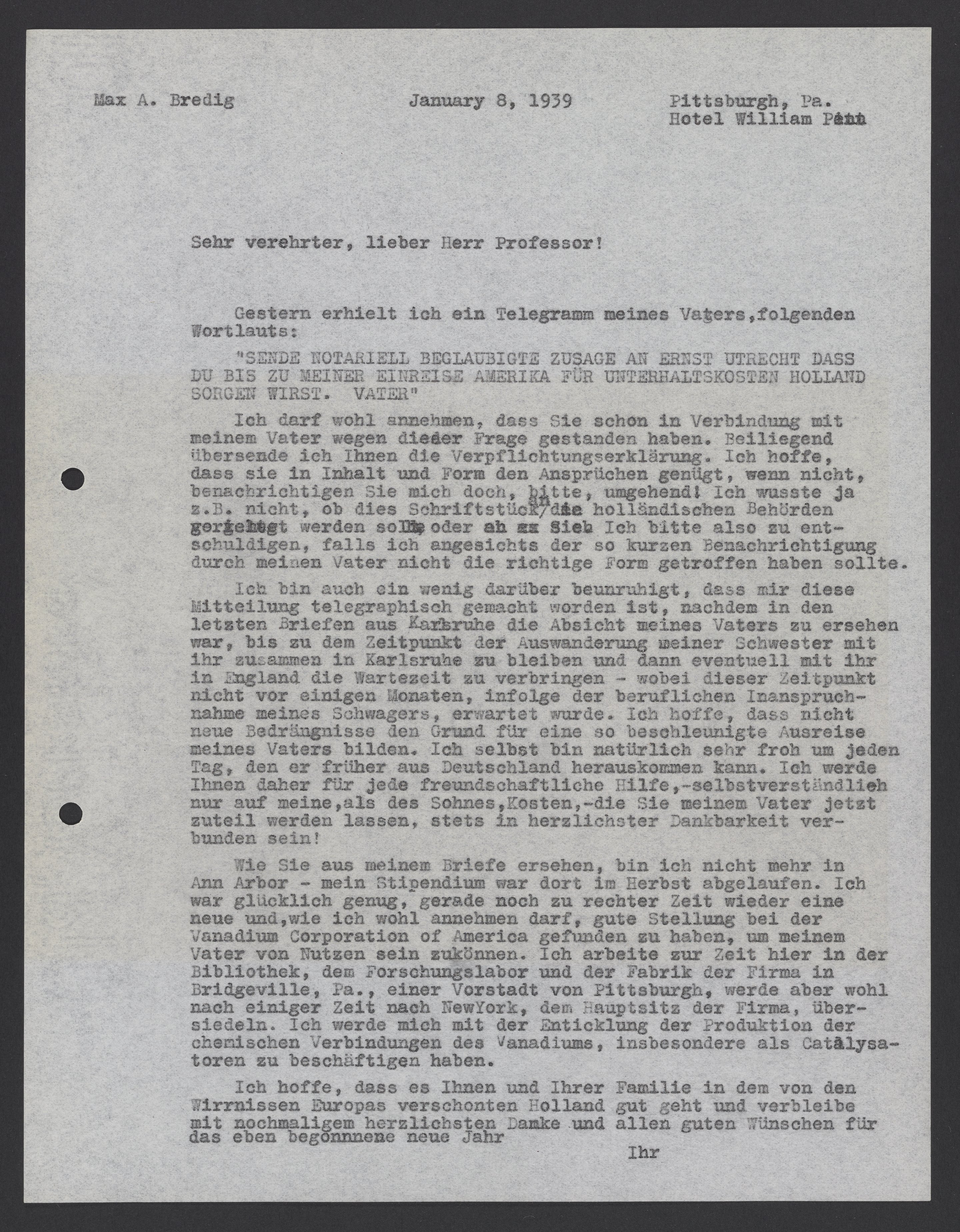 Wie Sie aus meinem Brief ersehen, bin ich nicht mehr in Ann Arbor – mein Stipendium war dort im Herbst abgelaufen. Ich war glücklich genug, gerade noch zu rechter Zeit wieder eine neue und, wie ich wohl annehmen darf, gute Stellung bei der Vanadium Corporation of America gefunden zu haben, um meinem Vater von Nutzen sein zu können. Ich arbeite zur Zeit hier in der Bridgeville, Pa., einer Vorstadt von Pittsburgh, werde aber wohl nach einiger Zeit nach New York, dem Hauptsitz der Firma, übersiedeln. Ich werde mich mit der Enticklung der Produktion der chemischen Verbindung des Vanadiums, insbesondere als Catalysatoren zu beschäftigen haben.