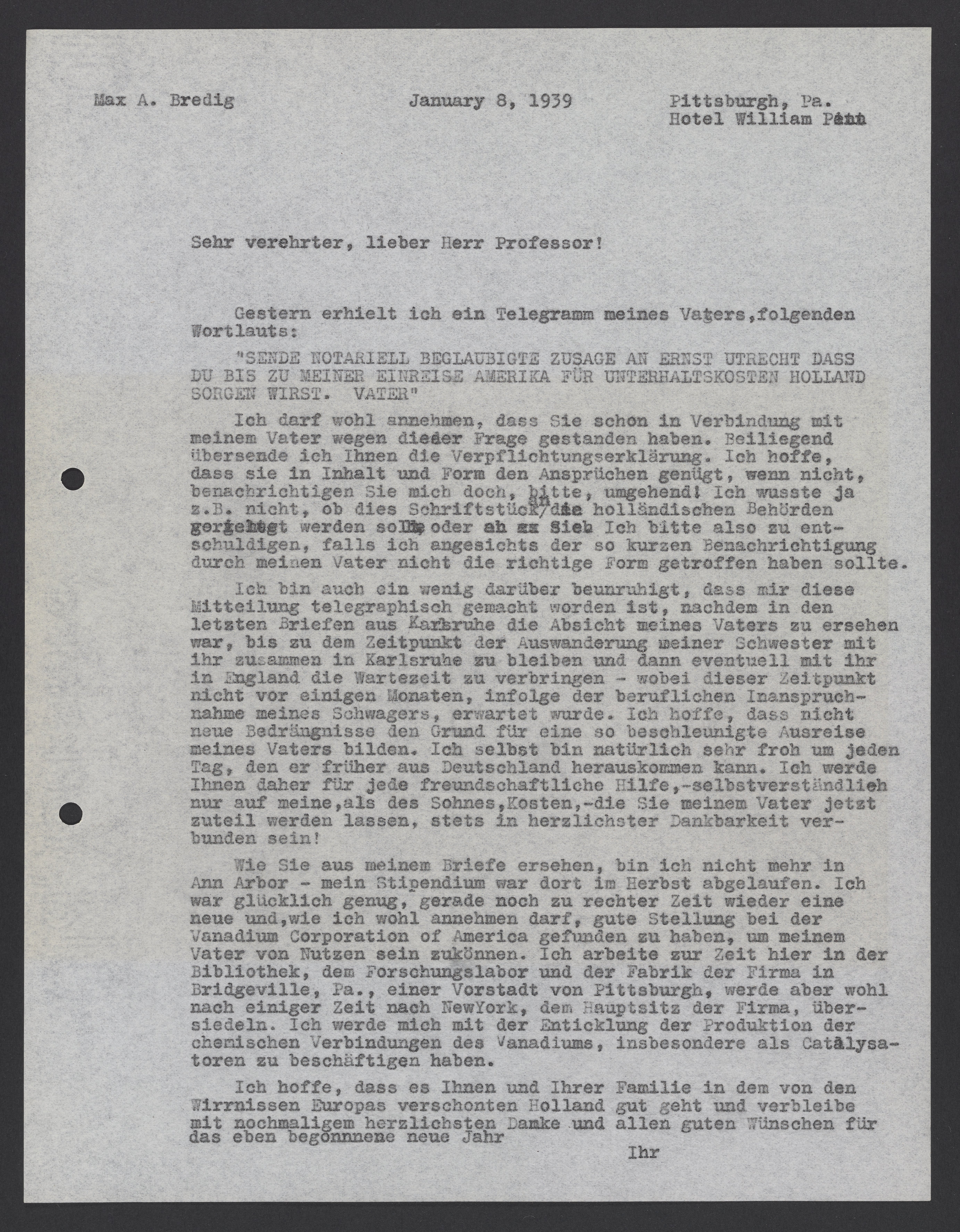 Wie Sie aus meinem Brief ersehen, bin ich nicht mehr in Ann Arbor – mein Stipendium war dort im Herbst abgelaufen. Ich war glücklich genug, gerade noch zu rechter Zeit wieder eine neue und, wie ich wohl annehmen darf, gute Stellung bei der Vanadium Corporation of America gefunden zu haben, um meinem Vater von Nutzen sein zu können. Ich arbeite zur Zeit hier in der Bridgeville, Pa., einer Vorstadt von Pittsburgh, werde aber wohl nach einiger Zeit nach New York, dem Hauptsitz der Firma, übersiedeln. Ich werde mich mit der Enticklung der Produktion der chemischen Verbindung des Vanadiums, insbesondere als Catalysatoren zu beschäftigen haben.
