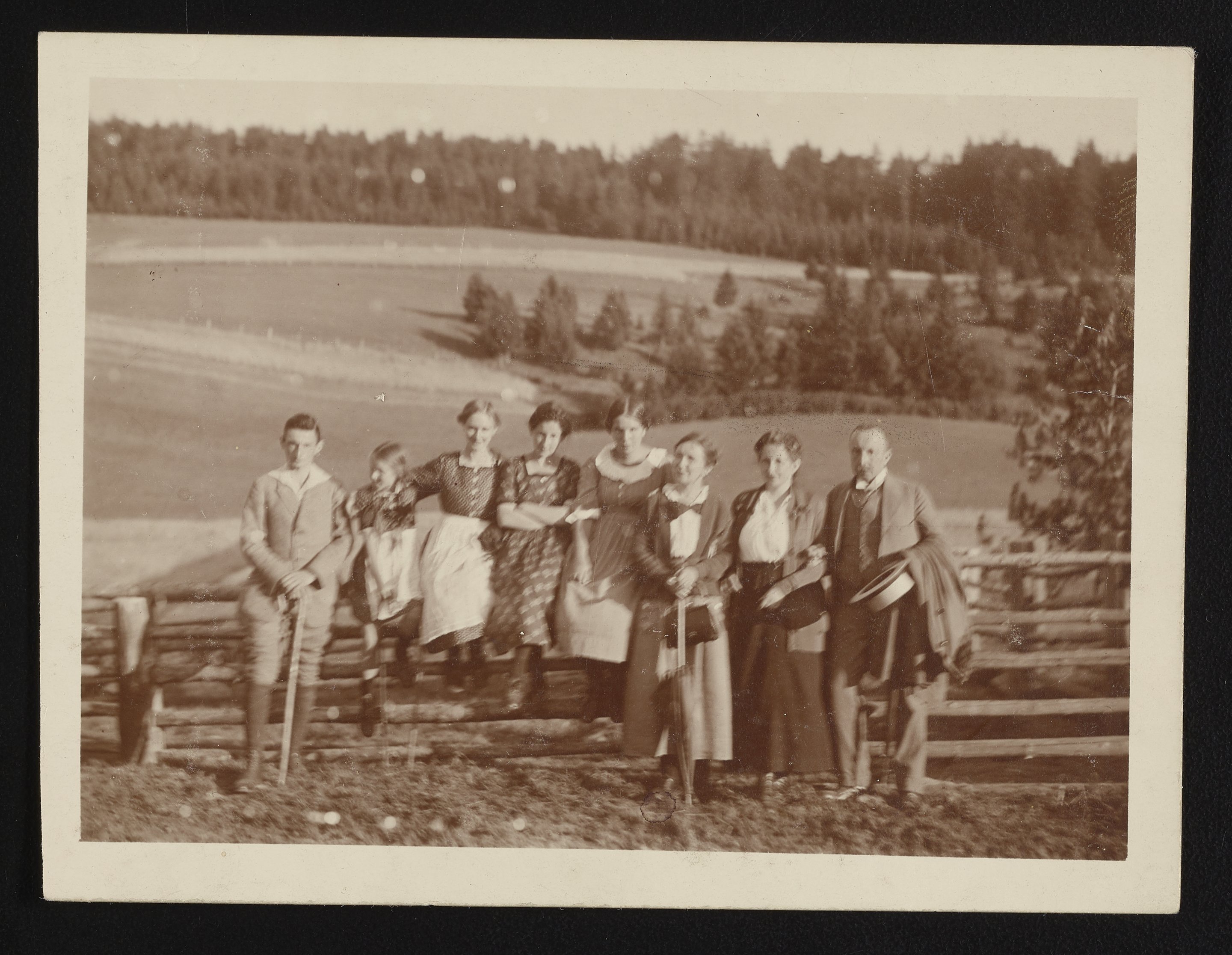 Photograph of Georg Bredig (1868-1944) and his family in the countryside. Bredig stands on the far right. To his left is possibly his wife Rosa Bredig, followed by her sisters known as Aunt Ida, Aunt Fränze, Aunt Käte, and Aunt Valley. His son, Max Albert Bredig (1902-1977), stands on the far left.