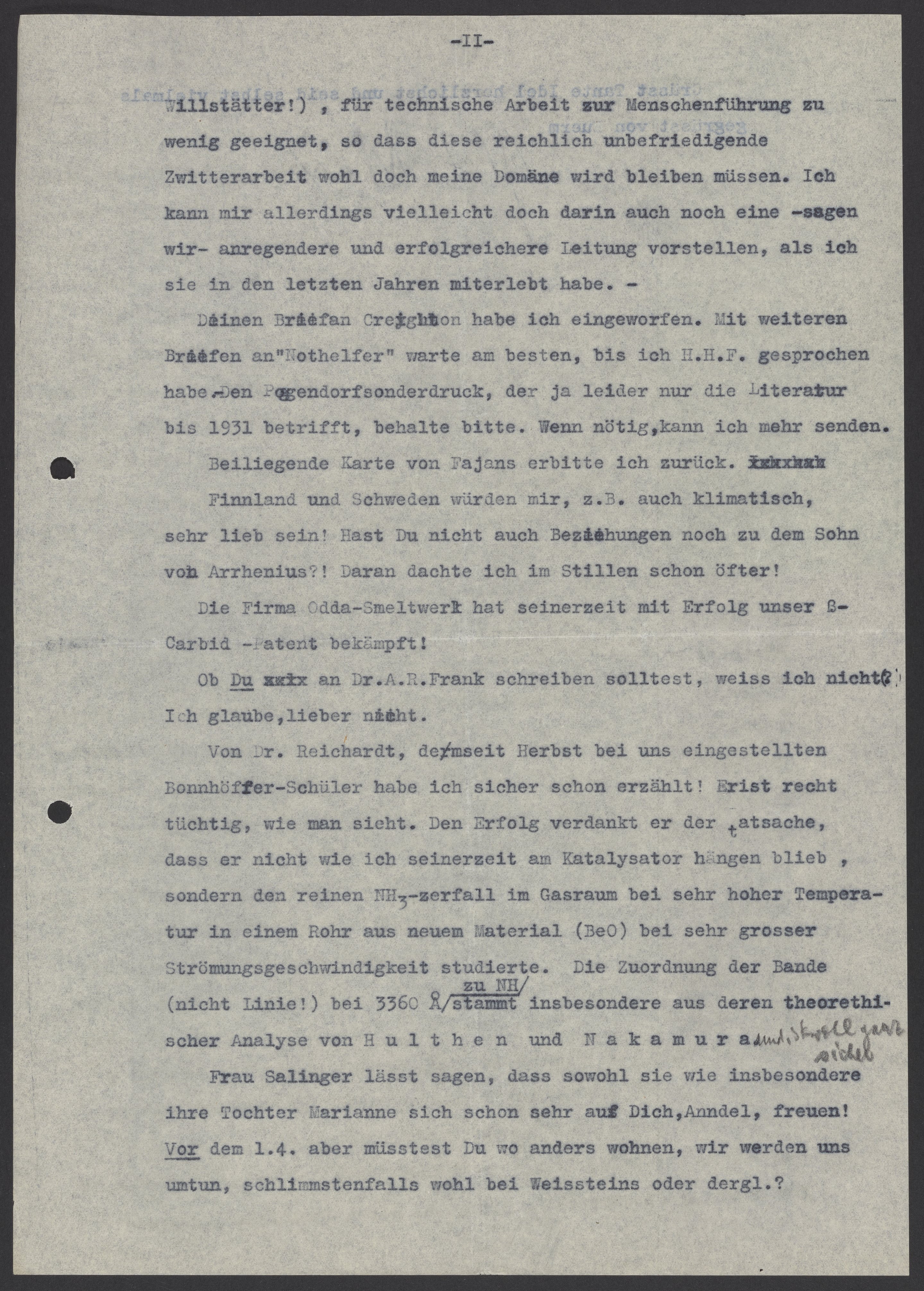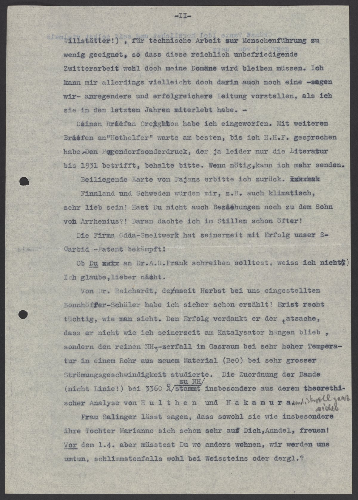 Small JPG1200 x 1669px — 420 KBLarge JPG2880 x 4005px — 2.4 MBFull-sized JPG5259 x 7313px — 7.2 MBOriginal fileTIFF — 5259 x 7313px — 110 MBMax Bredig (1902-1977) writes to his father, Georg Bredig (1868-1944), and his sister, Marianne Homburger (1903-1986). Max discusses his work and potential jobs in other countries. Max expresses that he feels like he is at a dead end in his current position.