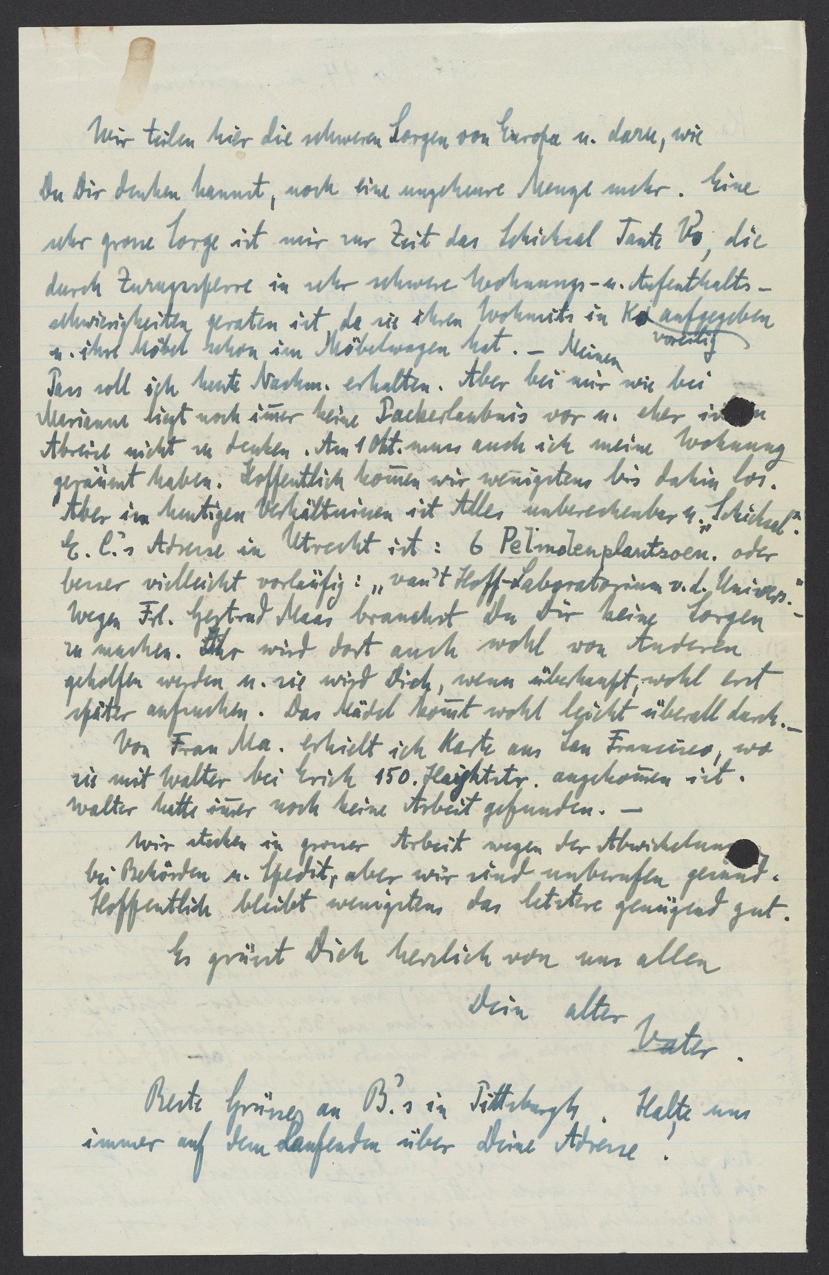 Wir teilen hier die schweren Sorgen von Europa u. dazu, wie Du Dir denken kannst, noch eine ungeheure Menge mehr. Eine sehr grosse Sorge ist mir zur Zeit das Schicksal Tante Va., die durch Zuzugssperre in sehr schwere Wohnungs – u. Aufenthaltsschwierigkeiten geraten ist, da sie ihren Wohnsitz in K. aufgegeben u. ihre Möbel schon im Möbelwagen hat. – Meinen Pass soll ich heute Nachmi. erhalten. Aber bei mir wie bei Marianne liegt noch immer keine Packerlaubnis vor u. eher ist eine Abreise nicht zu denken. Am 1 Okt. muss auch ich meine Wohnung geräumt haben. Hoffentlich kommen wir wenigstens bis dahin los. Aber in heutigen Verhältnissen ist Alles unberechenbar u. „Schicksal.“ E.C.‘s Adresse in Utrecht ist: 6 Pelmolenplantsoen. oder besser vielleicht „van’t Hoff-Laboratorium v. d. Univers.“ Wegen Frl. Gertrud Maas brauchst Du Dir keine Sorgen zu machen. Ihr wird dort auch wohl von Anderen geholfen werden u. sie wird Dich, wenn überhaupt, wohl erst später aufsuchen. Das Madel kommt wohl leicht überall durch. –