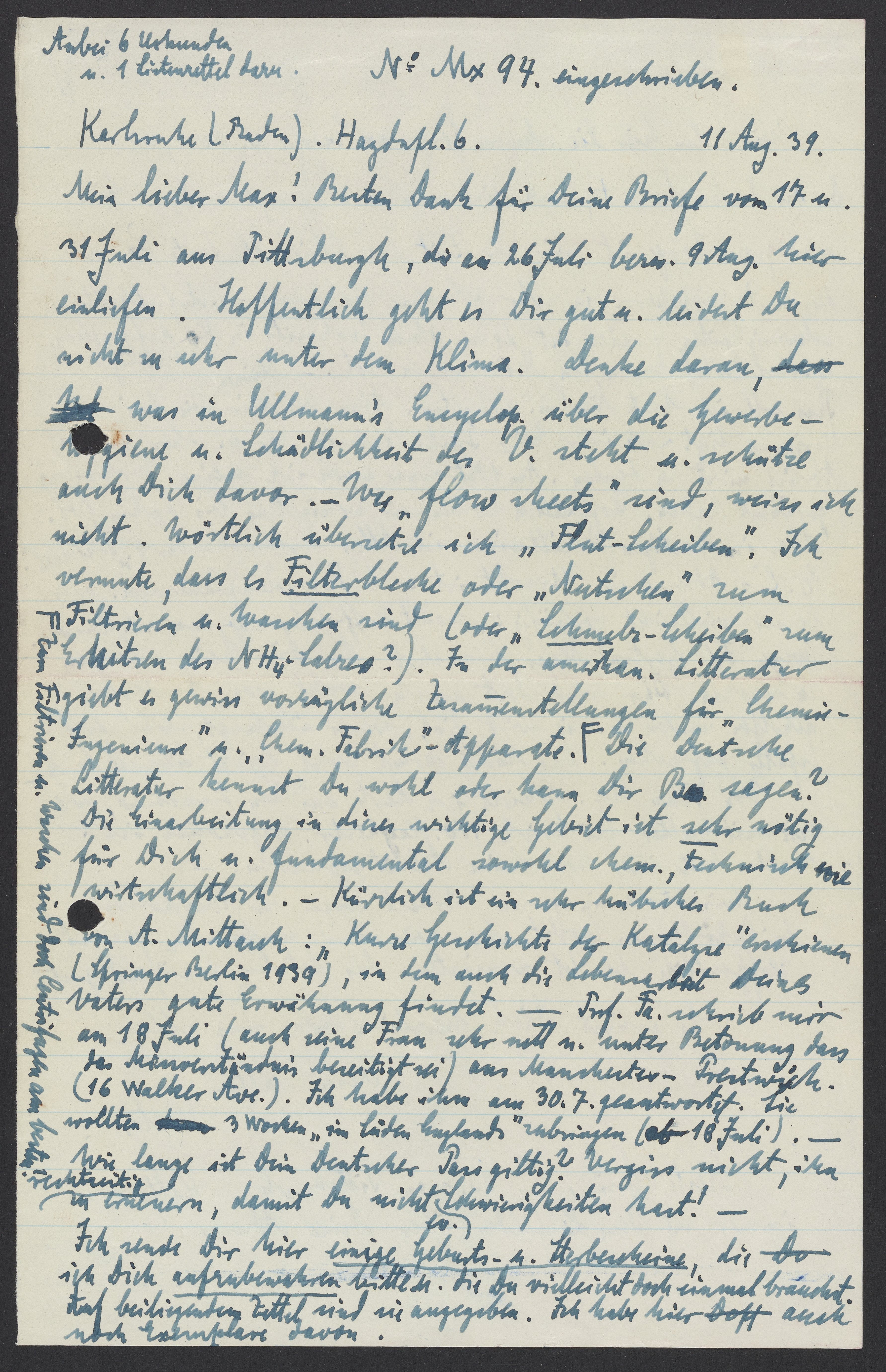 Mein lieber Max! Besten Dank für Deine Briefe vom 17. u. 31. Juli aus Pittsburgh, die am 26. Juli bzw. 9. Aug. hier einliefen. Hoffentlich geht es Dir gut u. leidest Du nicht zu sehr unter dem Klima. Denke daran, was in Ullmann’s Encyclop. ueber die Gewerbehygiene u. Schädlichkeit des. V. steht u. schütze auch Dich davor. – Was „flow sheets sind“ weiss ich nicht. Wörtlich übersetze ich „Flut-Scheiben.“ Ich vermute, dass es Filterbleche oder „Nutschen“ zu Filtrieren u. Waschen sind (oder „Schmelz-Scheiben“ zum Erhitzen des NH4-Salzes?) In der amerikan. Litteratur gient es gewiss vorzügliche Zusammenstellungen für „Chemie u. Ingenieure“ u. „Chem. Fabrik“- Apparate.* Die Deutsche Litteratur kennst Du wohl oder kann Dir B. sagen? Die Einarbeitung in dieses wichtiges Gebiet ist sehr nötig für Dich u. fundamental sowohl chem., technisch wie wirtschaftlich. – Kürzlich ist ein sehr hübsches Buch von A. Mittasch: „Kurze Geschichte der Katalyse“ erschienen. (Springer Berlin 1939), in dem die Lebensarbeit Deines Vaters gute Erwähnung findet. Prof. Fa. schrieb mir am 18. Kuli (auch seine Frau sehr nett u. unter Betonung dass die Missverständnis beseitigt sei) aus Manchester-Prestwich (16 Walker Ave.) Ich habe ihn am 30. 7. Geantwortet. Sie wollten 3 Wochen „im Süden Englands“ zubringen (ab 18 Juli). – Wie lange ist Dein Deutscher Pass gültig? Vergiss nicht, ihn rechtzeitig zu erneuern, damit Du nicht ev. Schwierigkeiten hast!