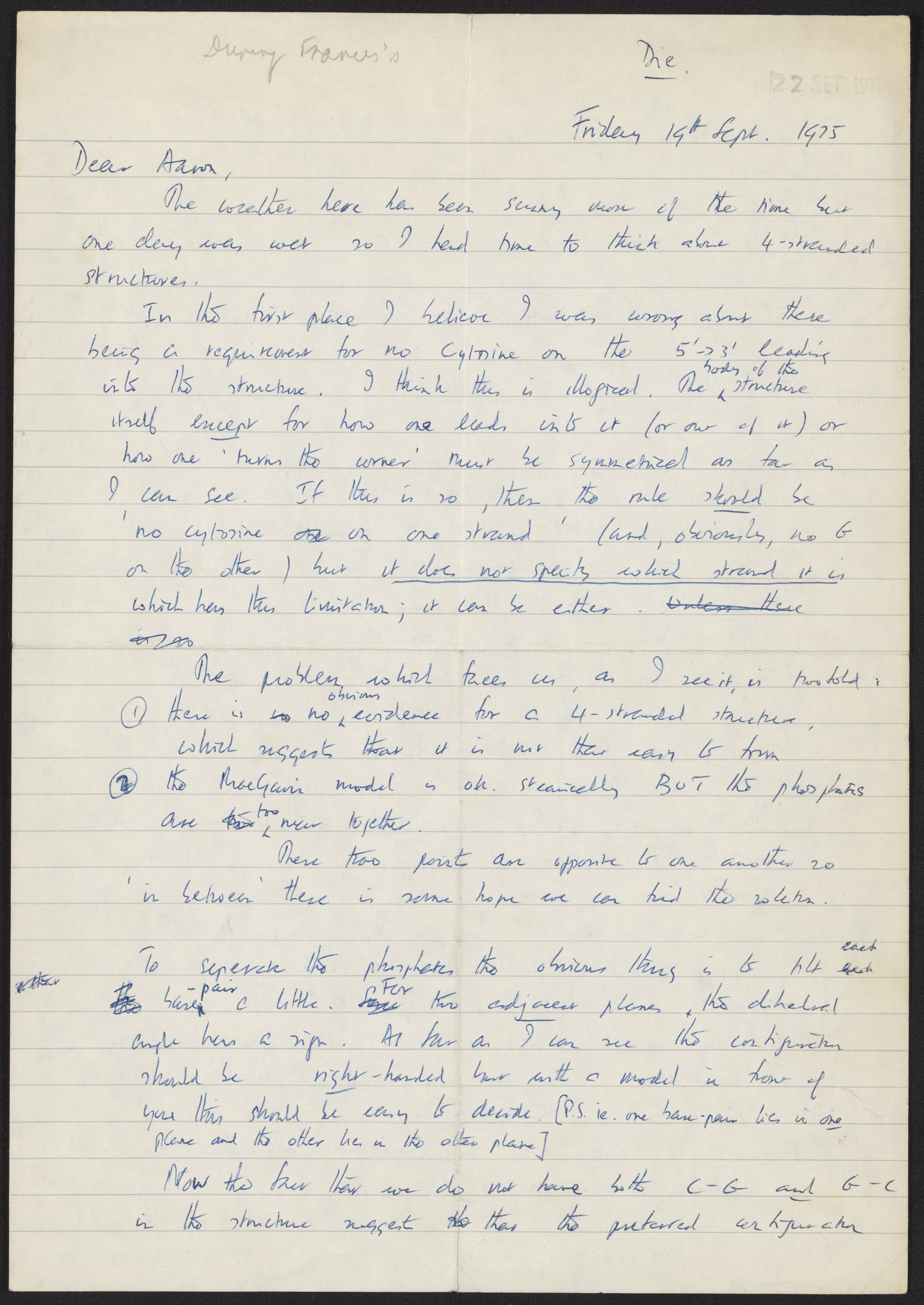 Letter from Francis Crick to Aaron Klug, September 19, 1975
