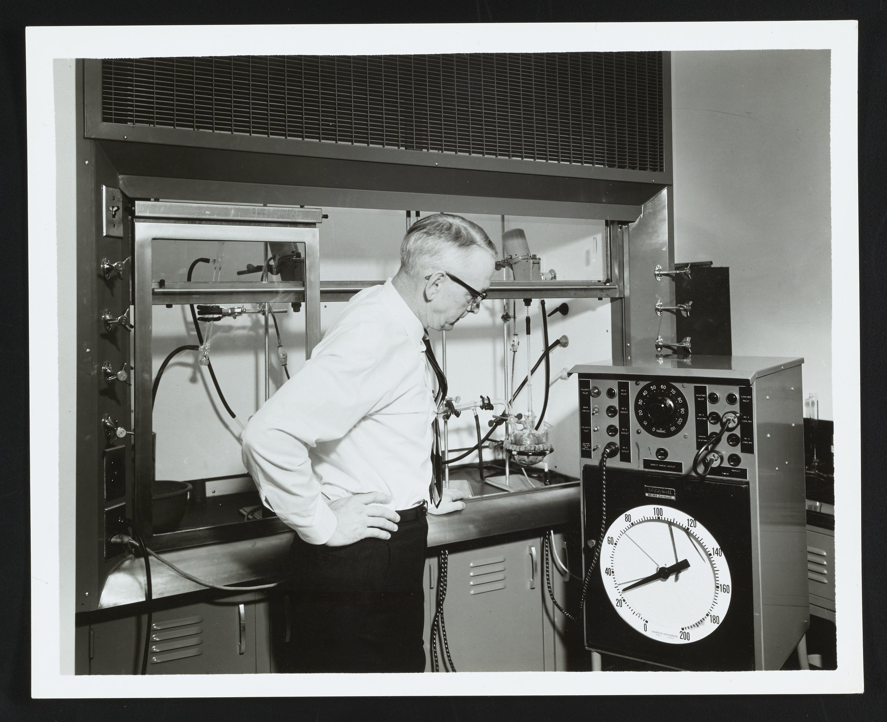 “George Garcelon Inspects Temperature Monitoring Device,” 1966. Photographs from the Records of the Althouse, Bates, and Crompton Chemical Companies, Box 1. Science History Institute. Philadelphia. https://digital.sciencehistory.org/works/9w032304k.