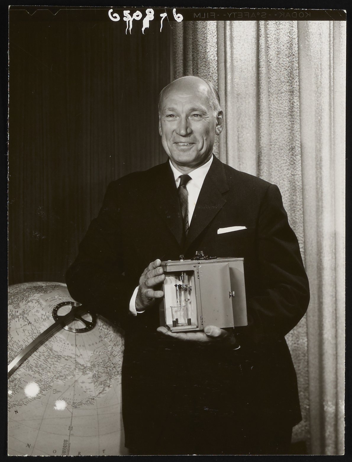 “Portrait of Arnold O. Beckman (1900-2004) Holding a PH Meter,” 1960–1969. Beckman Historical Collection, Box 56, Folder 33. Science History Institute. Philadelphia. https://digital.sciencehistory.org/works/9w032307d.