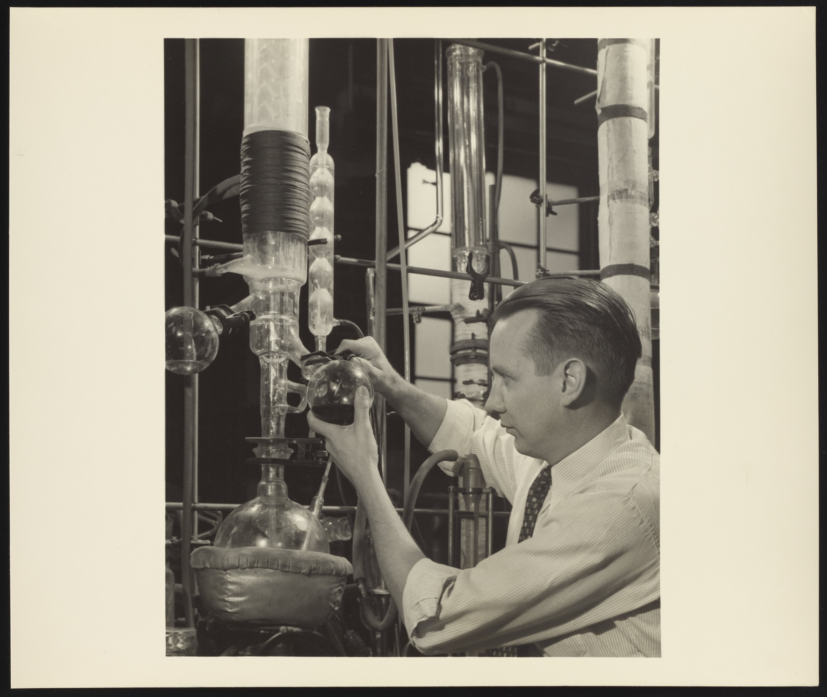 Dow Chemical Company. “Roger Monroe in Aromatics Laboratory at Dow Chemical Company,” circa 1955. Dow Chemical Company Historical Image Collection, Box Oversized Plants 1. Science History Institute. Philadelphia. https://digital.sciencehistory.org/works/9w032339p.