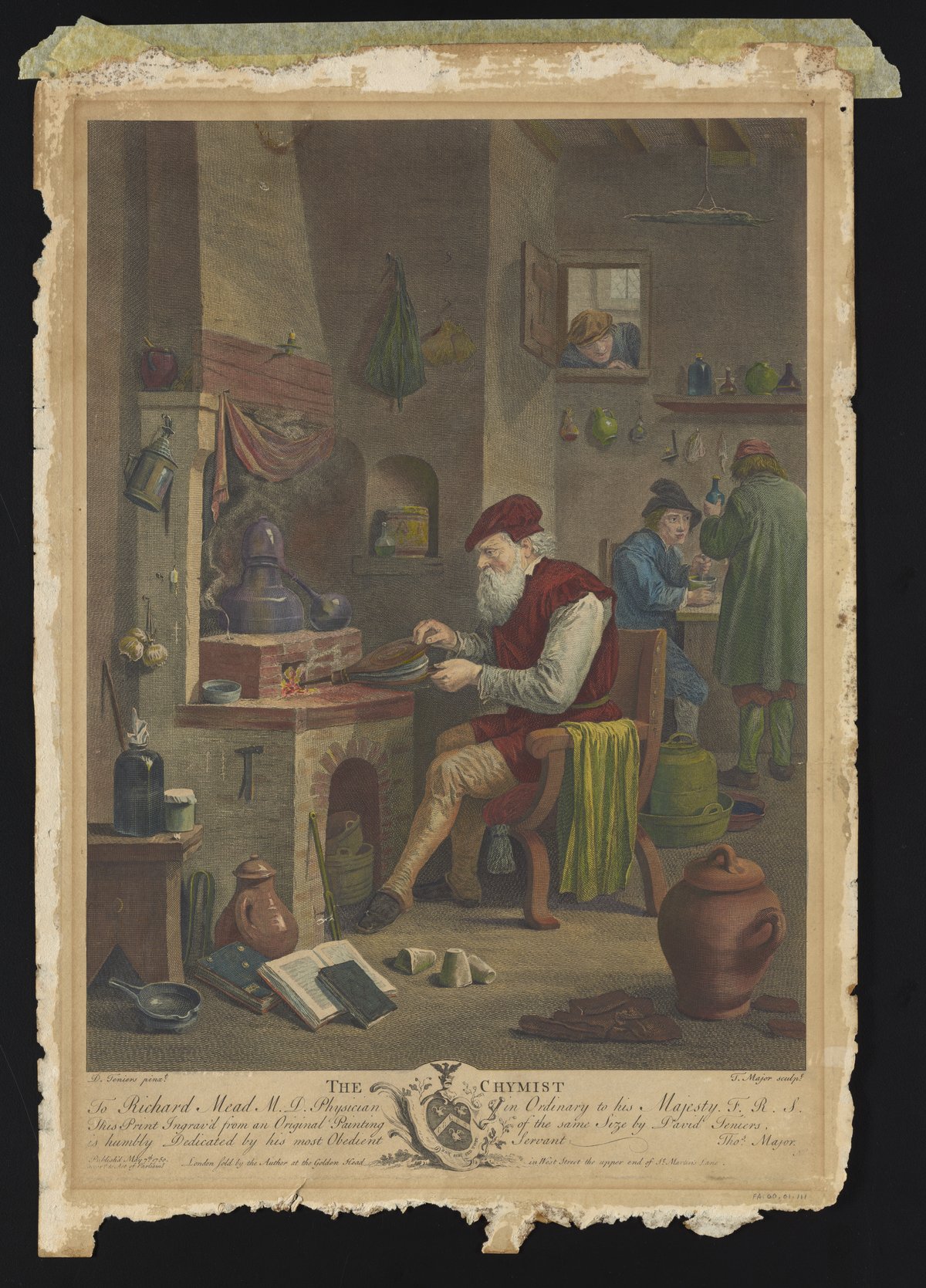 This print, engraved by Thomas Major and dedicated to his patron, the royal physician Richard Mead, reproduces a painting by David Teniers II. This copy of the print has been hand-colored. An elderly, finely-dressed alchemist uses a pair of hand-bellows to heat the coals beneath his distillation apparatus. Seated before a furnace, he is surrounded by open books, pans, flasks, and earthenware vessels. Behind him a pair of assistants work with a mortar and pestle at a table, while a third man looks on from a window above. The shop appears orderly and productive.