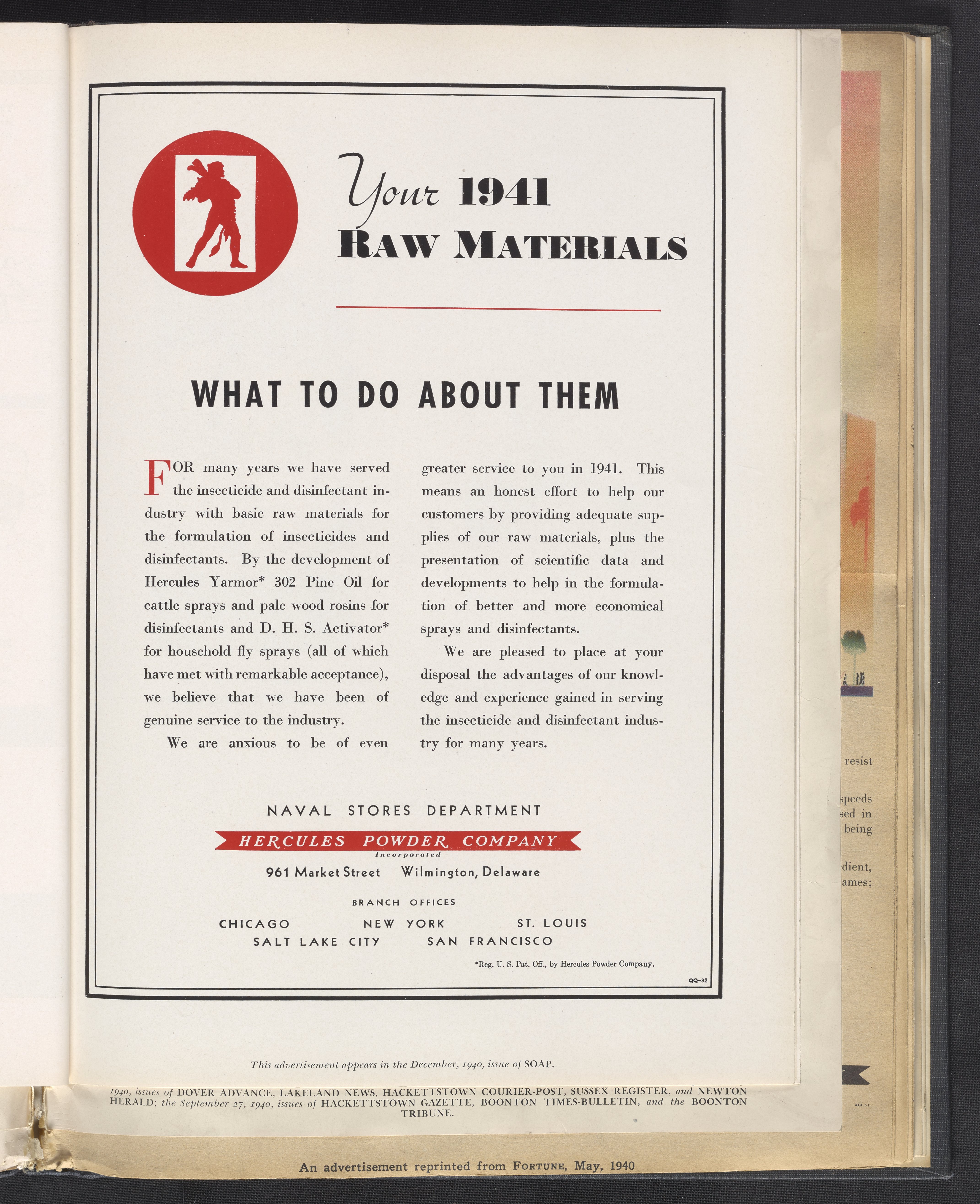 Advertisement for various naval stores products, including Yarmor 302 Pine Oil and D.H.S. Activator, manufactured and sold by the Hercules Powder Company for use as raw materials in the formulation of insecticides and disinfectants. This advertisement was published in the December 1940 issue of Soap.