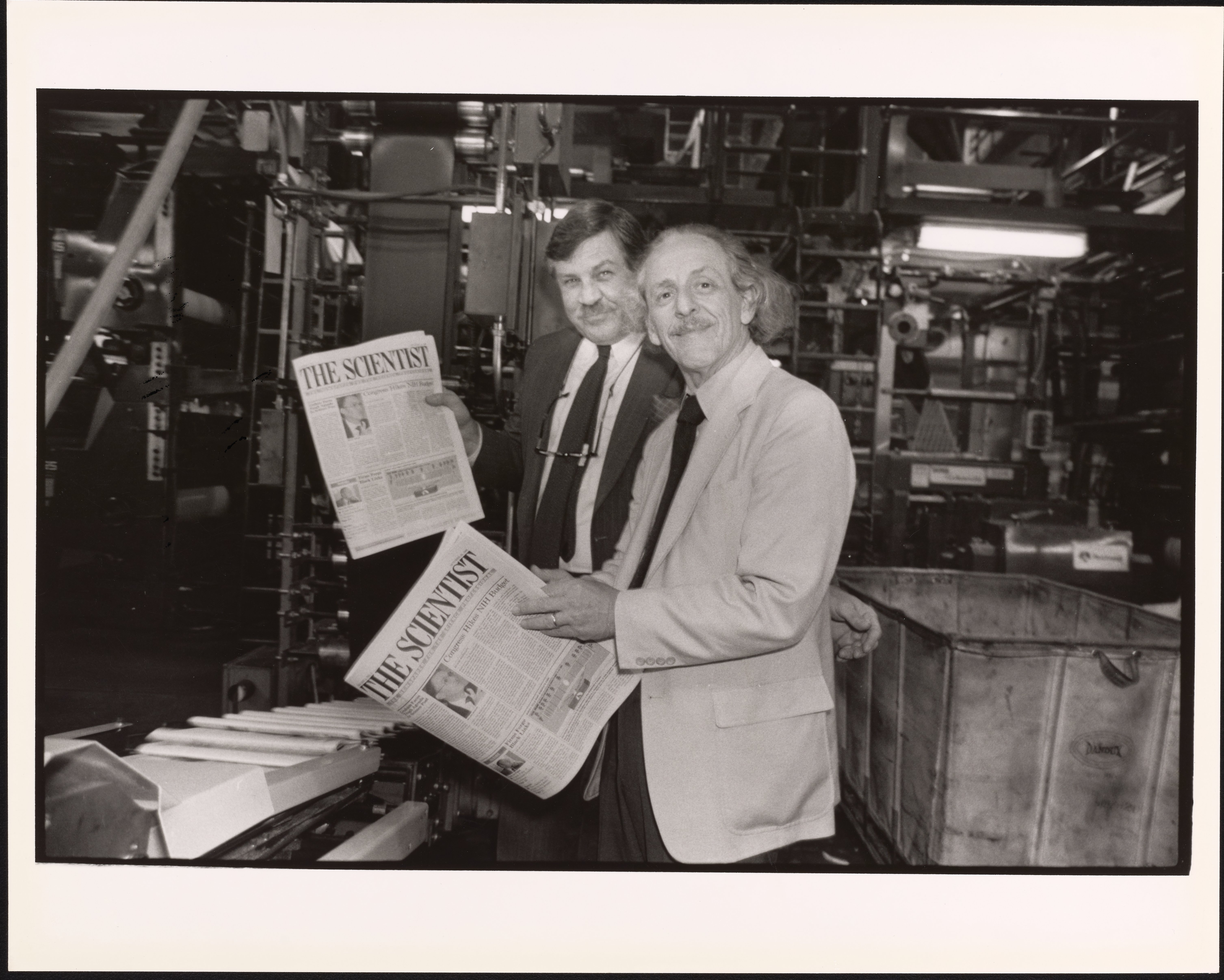 Institute for Scientific Information general manager, Roland "Rolly" Holub, and founder, Eugene Garfield (1925-2017), stand in front of a newspaper press, each holding a copy of the first issue of The Scientist. The monthly publication sought to report news of interest to the scientific community. According to Garfield, “As I see it, there is a need for a publication that supplies news about the economics and financing of science, as well as science policy, regulatory issues, and the ethical debates of science. Also needed is more coverage of personalities, as well as news about research grants, forthcoming meetings, awards, and all the other minutiae that make up the lives of working scientists...” The publication was sold several times since its genesis but is still in publication today. Now, the periodical, which is owned and operated by the LabX Media Group, primarily functions as a professional magazine for life scientists.