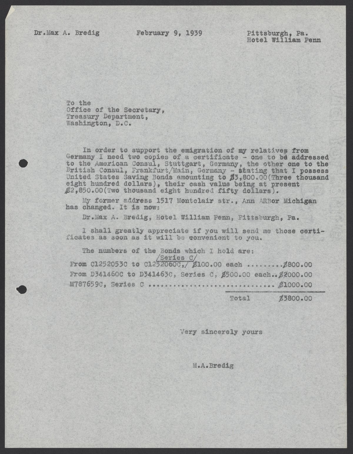 Max Albert Bredig (1902-1977) requests certificates confirming the amounts of his United States saving bonds from the United States Treasury Department. These certificates, which will be sent to consulates in Germany, are to help the emigration process for Bredig's family.
