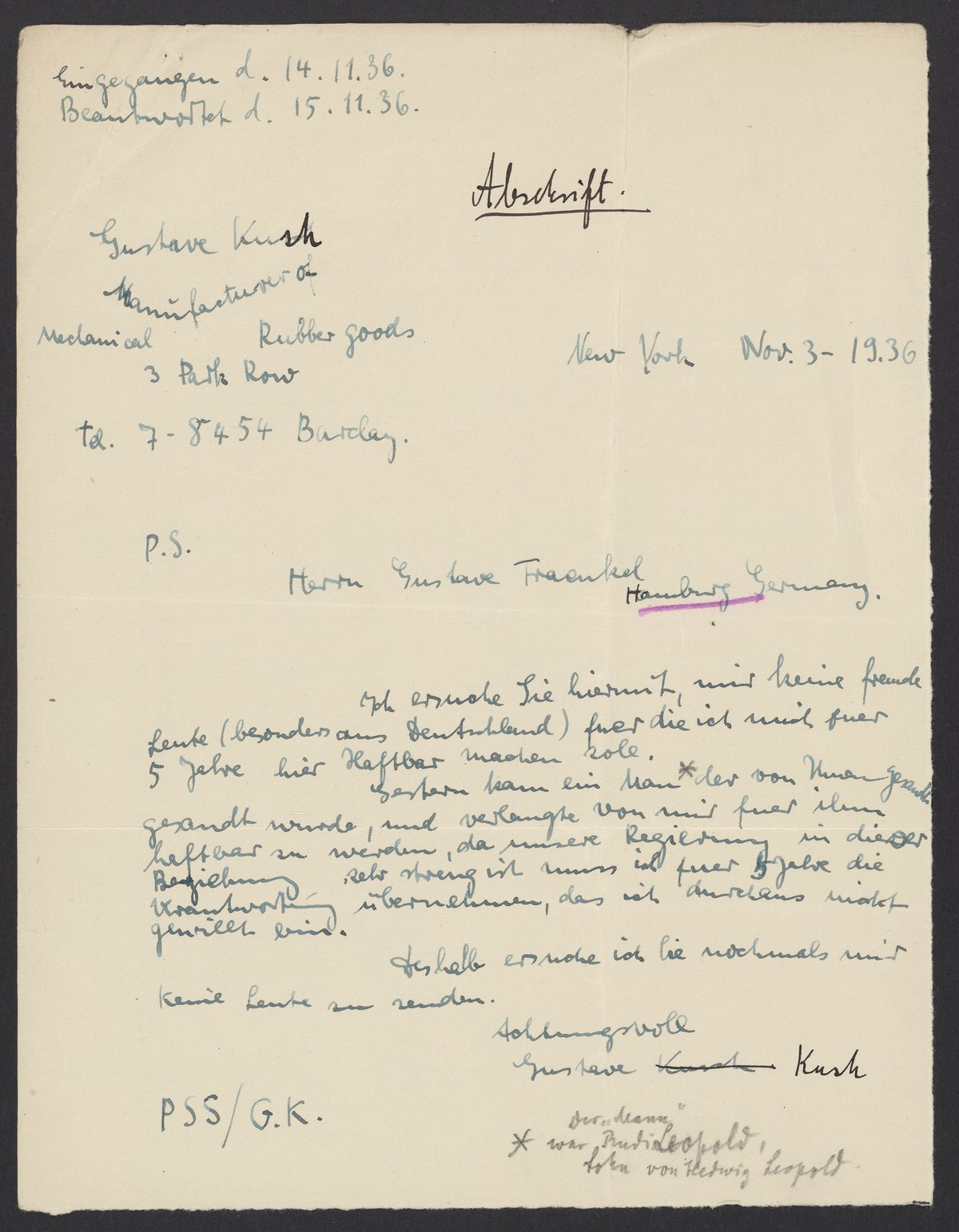 Letter to Gustav Fraenkel, November 1936