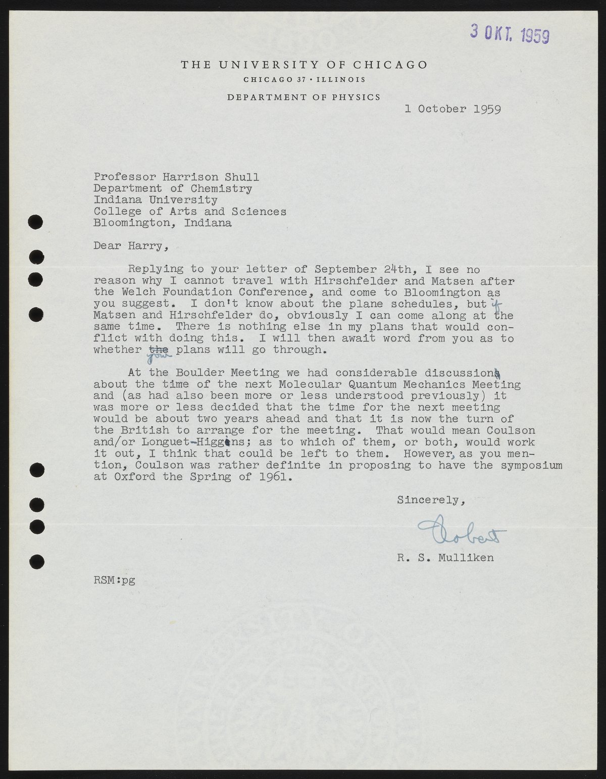 Mulliken, Robert Sanderson. “Letter from Robert S. Mulliken to Harrison Shull, 1959,” October 1, 1959. Robert S. Mulliken & Harrison Shull Correspondence, Box 1. Science History Institute. Philadelphia. https://digital.sciencehistory.org/works/9z902z90g.