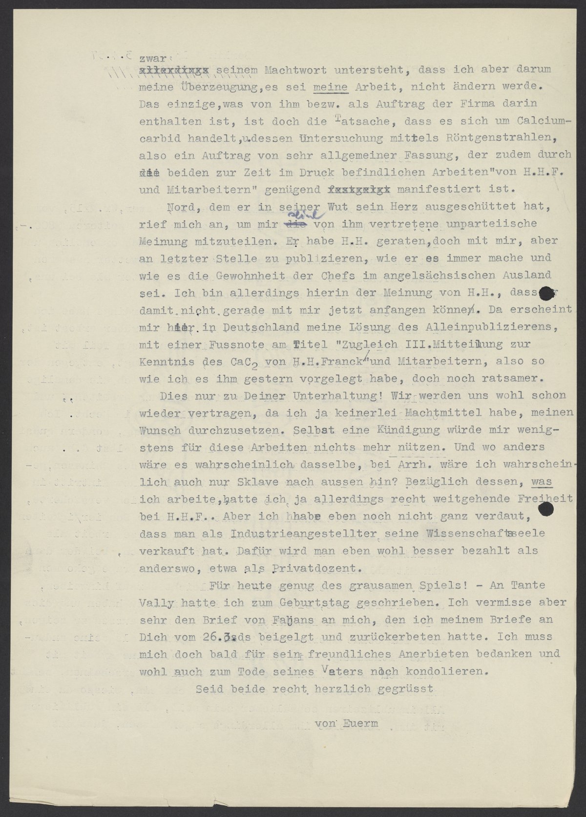 Nord, dem er in seiner Wut sein Herz ausgeschüttet hat, rief mich an um mir seine von ihm vertretene unparteiische Meinung mitzuteilen. Er habe H.H. geraten, doch mit mir, aber an letzter Stelle zu publizieren, wie er es immer mache und wie es die Gewohnheit der Chefs im angelsächsischen Ausland sei. Ich bin allerdings hierin der Meinung von H.H, dass er damit nicht gerade mit mir jetzt anfangen könne. Da erscheint mir hier in Deutschland meine Lösung des Alleinpublizierens, mit einer Fussnote am Titel "Zugleich III. Mitteilung zur Kenntnis des CaC2 von H.H.Franck" und Mitarbeitern, also so wie ich es ihm gestern vorgelegt habe, doch noch ratsamer.