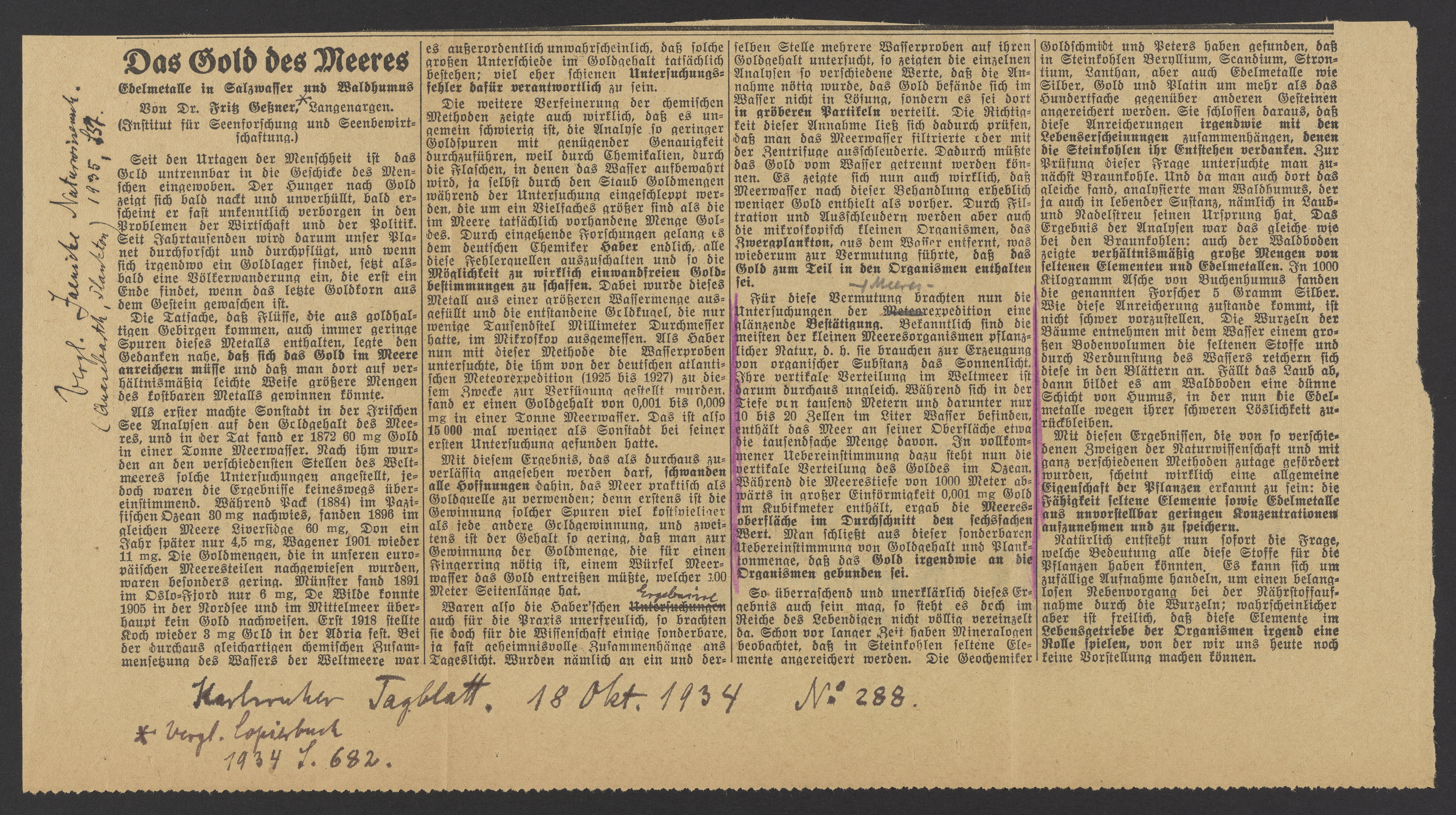 Clipping of an article from the Karlsruher Tagblatt titled Das Gold des Meeres Edelmetalle in Salzwasser und Waldhumus by Dr. Fritz Getzner. In English, the title translates to The Gold of the Sea: Precious Metals in Salt Water and Forest Humus.