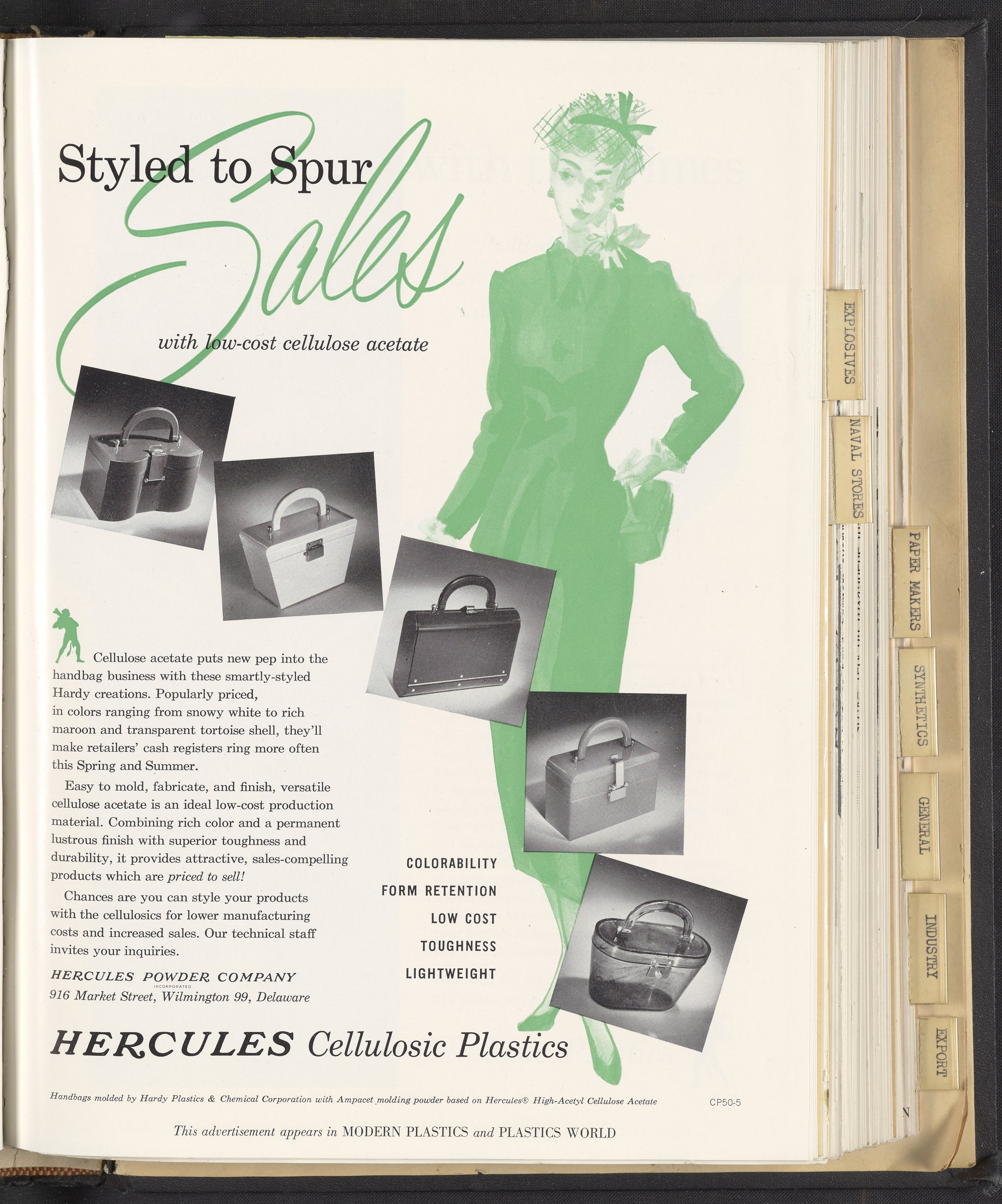 Hercules Incorporated. “Styled to Spur Sales with Low-Cost Cellulose Acetate.” 1950 Hercules Advertisements, 1950. Records of Hercules Incorporated, Volume 1950. Science History Institute. Philadelphia. https://digital.sciencehistory.org/works/a215s8c.