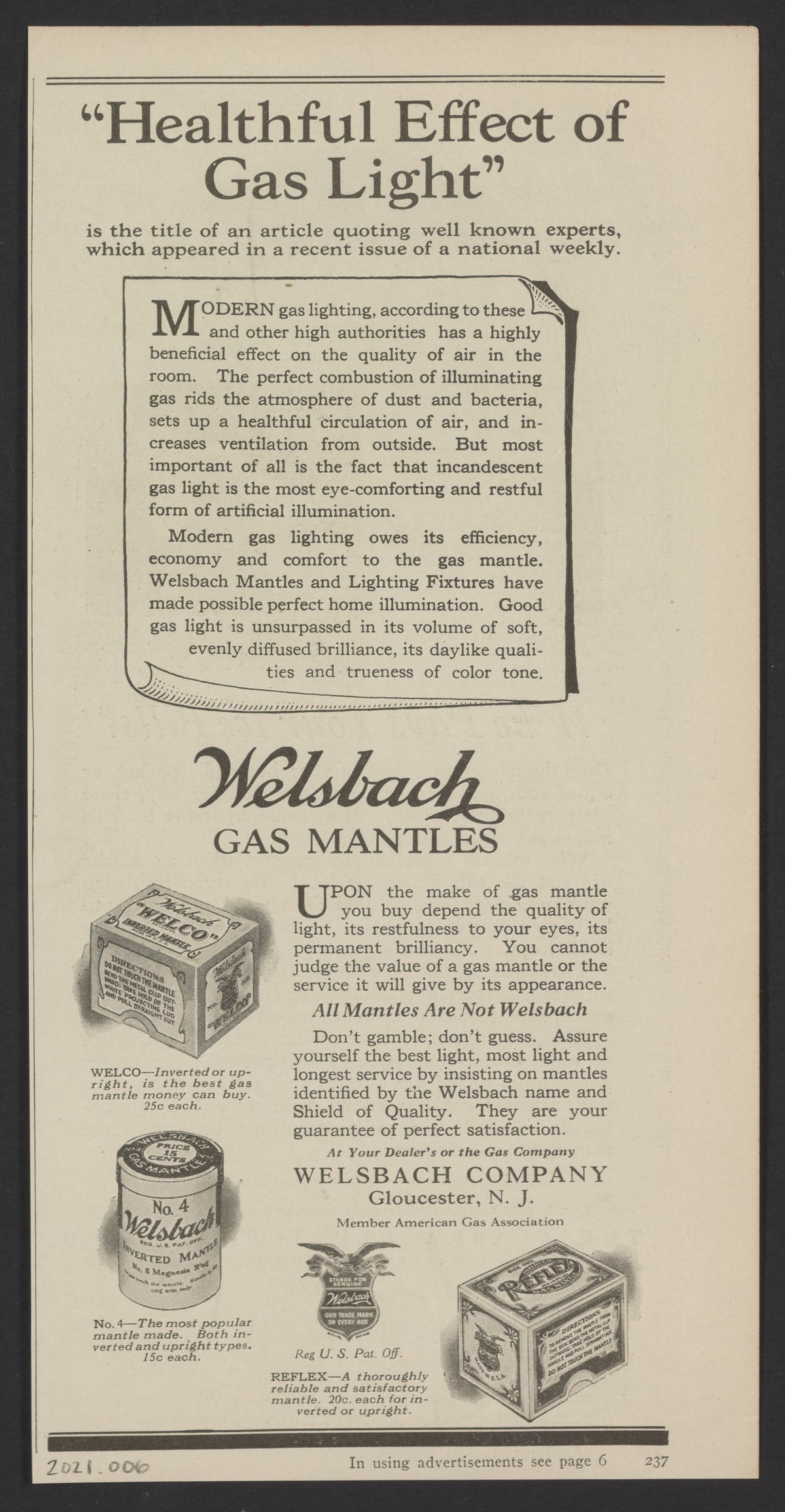 Gas mantles and electric bulbs competed for the home lighting market during the first decades of the 20th century. This advertisement claimed modern gas lighting offered health benefits by ridding the atmosphere of dust and bacteria, while combustion set up a healthful circulation of air inside buildings.