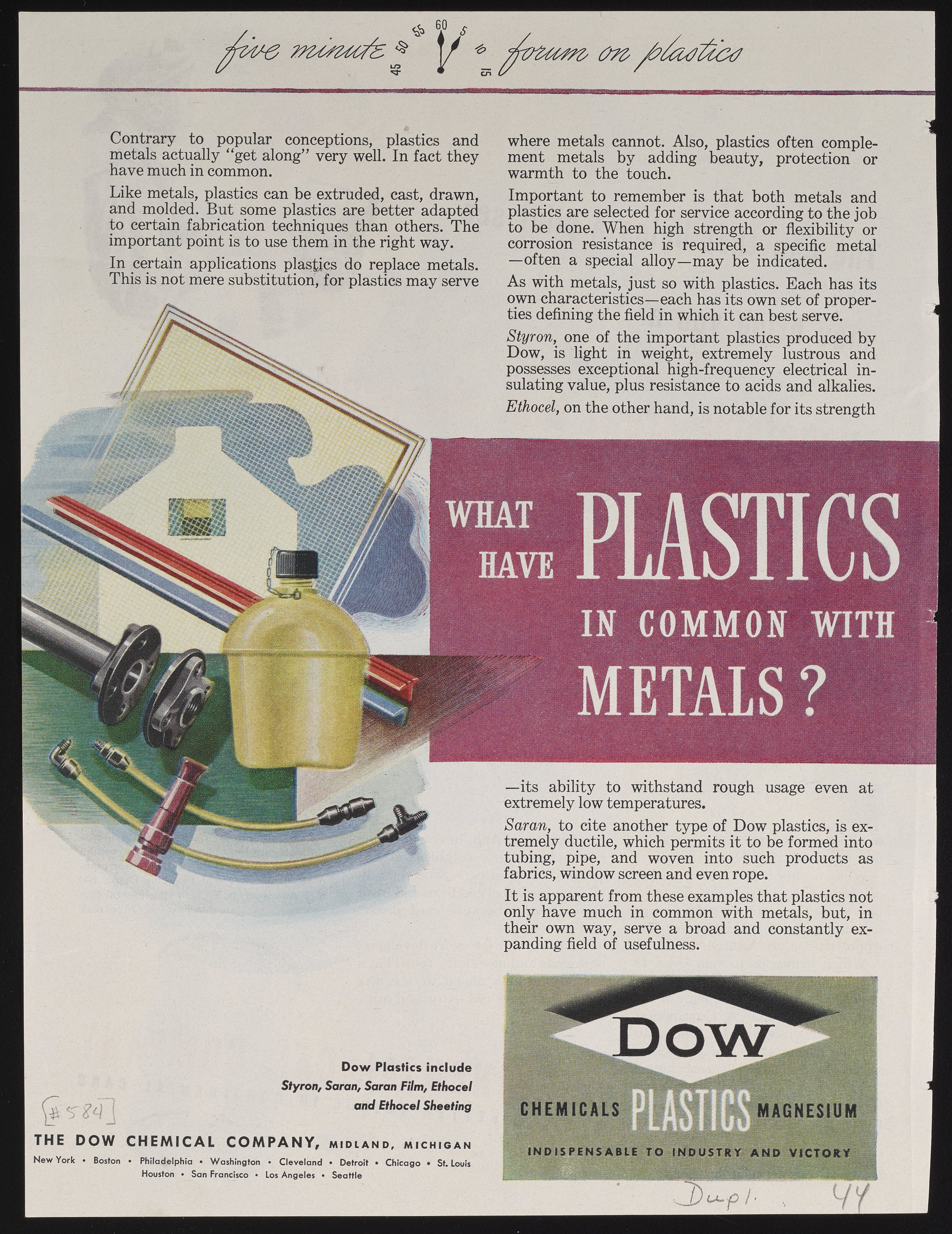 Dow Chemical Company. “What Have Plastics in Common with Metals?,” 1944. Advertisements from the Dow Chemical Historical Collection, Box 9. Science History Institute. Philadelphia. https://digital.sciencehistory.org/works/a4ruqss.