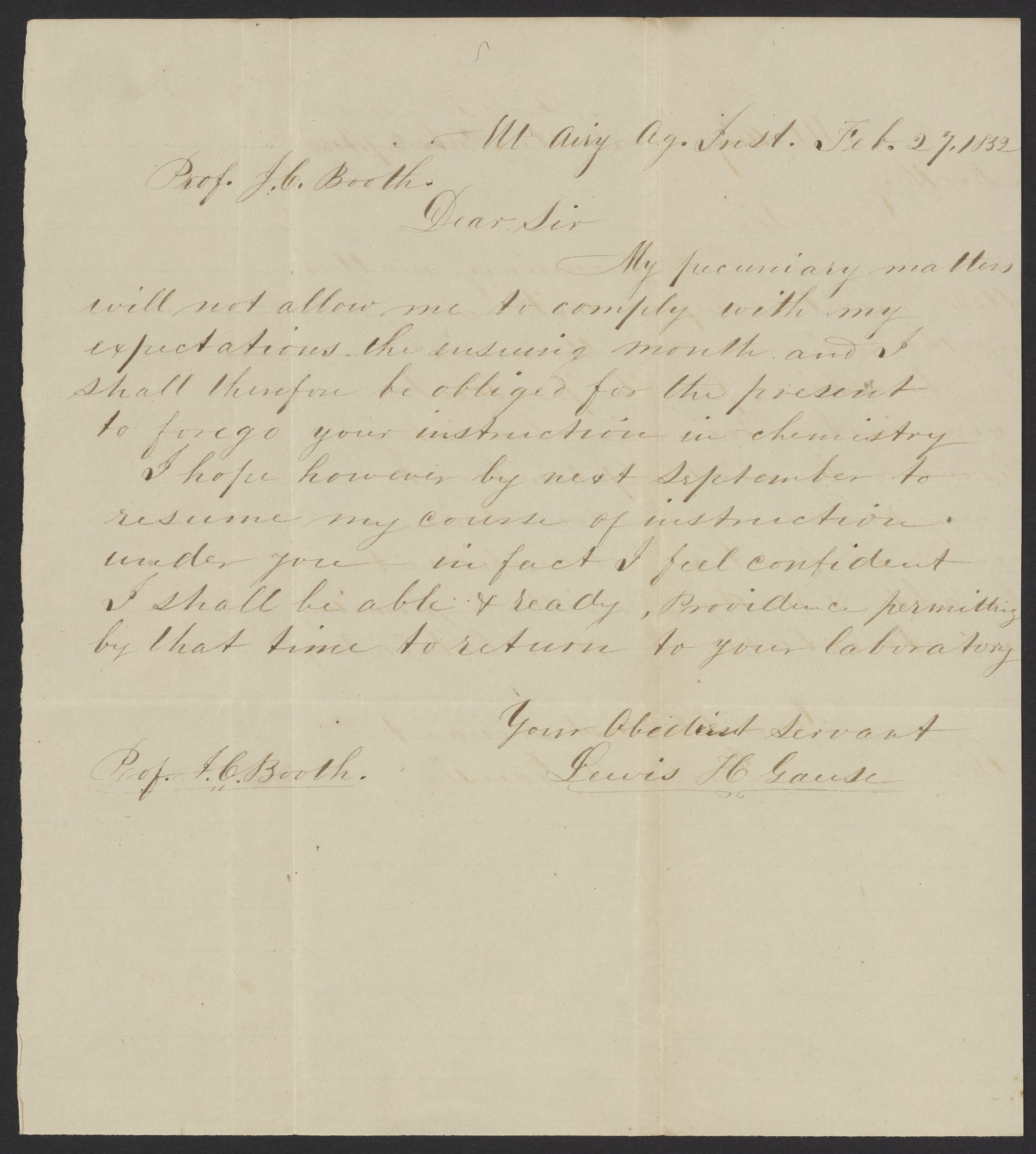 Gause, Lewis H. “Letter from Lewis H. Gause to James Curtis Booth,” February 27, 1832. Papers of James Curtis Booth, Box 1, Folder 2. Science History Institute. Philadelphia. https://digital.sciencehistory.org/works/a76z9qh.