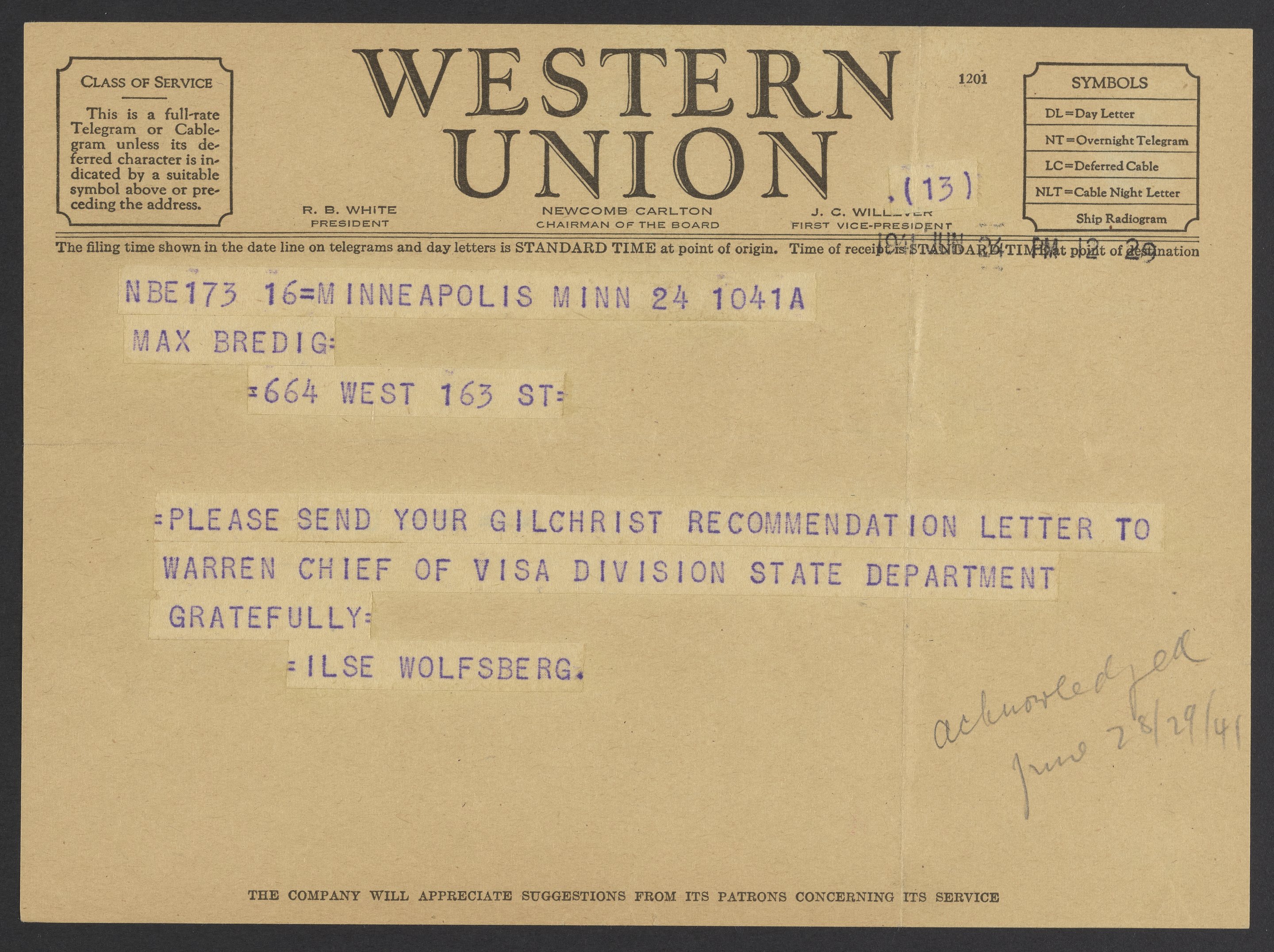 Telegram from Ilse Wolfsberg to Max Bredig, June 24, 1941