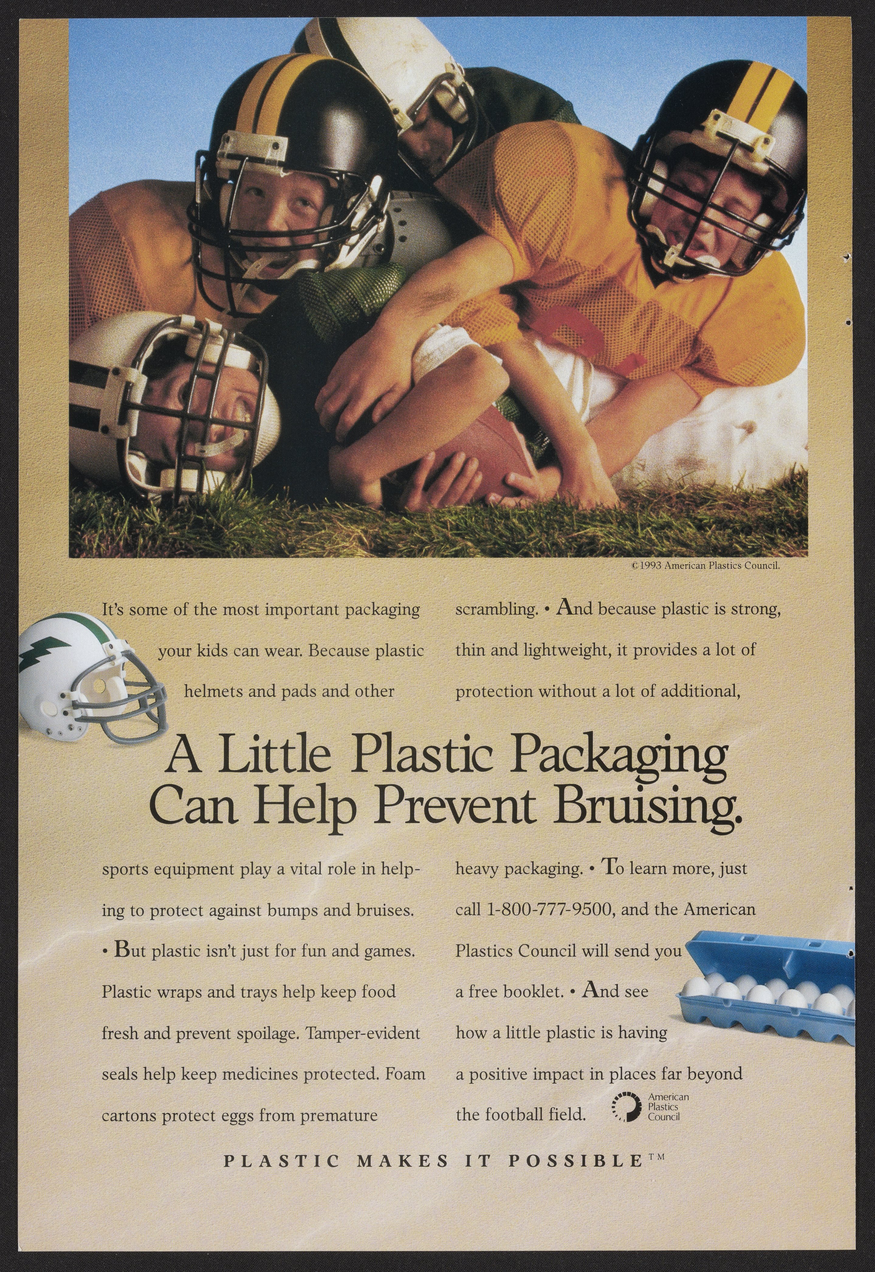 Advertisement by the American Plastics Council, featuring children playing football. The ad highlights how, from egg cartons to sports equipment, plastic can be used to keep people safe.
