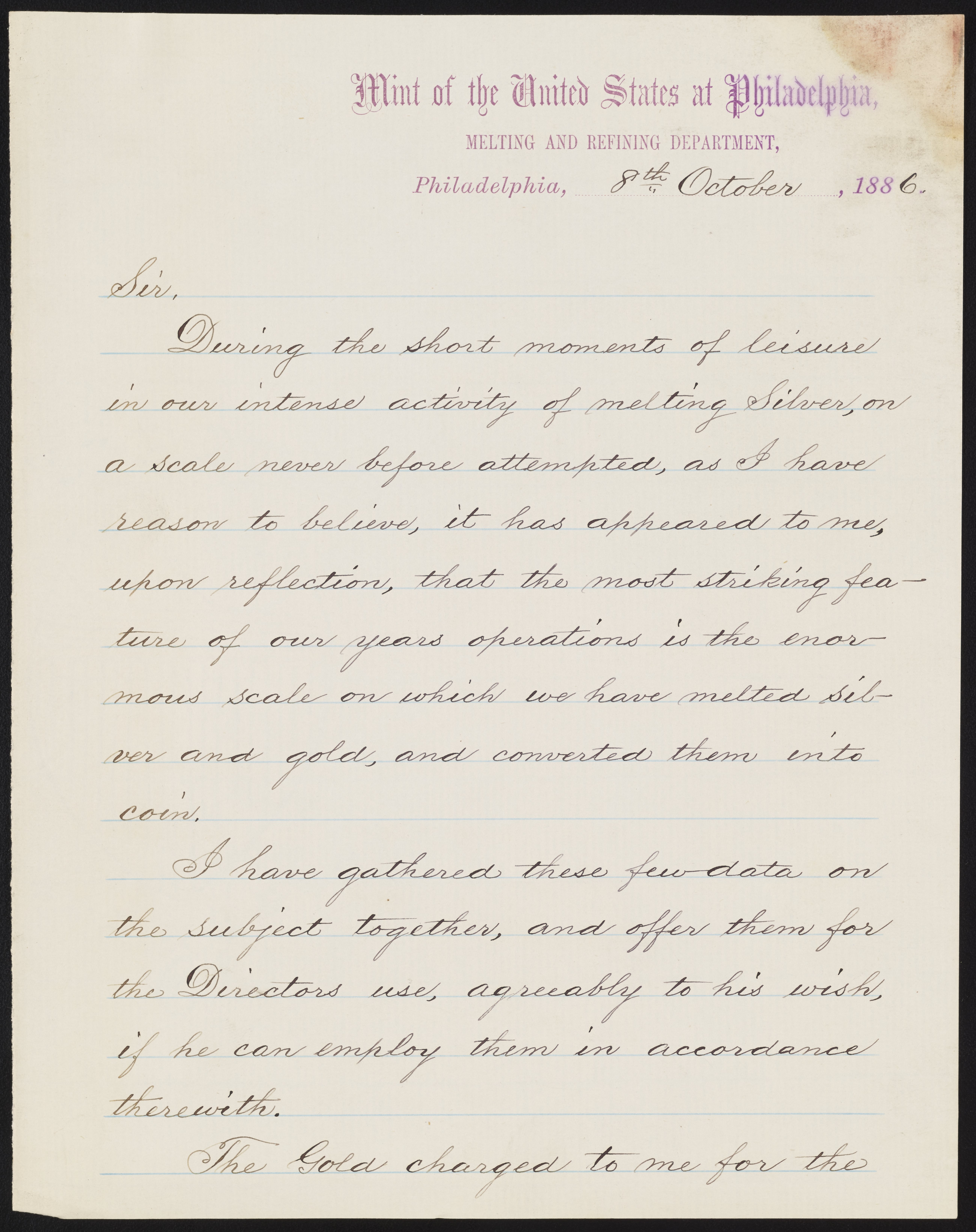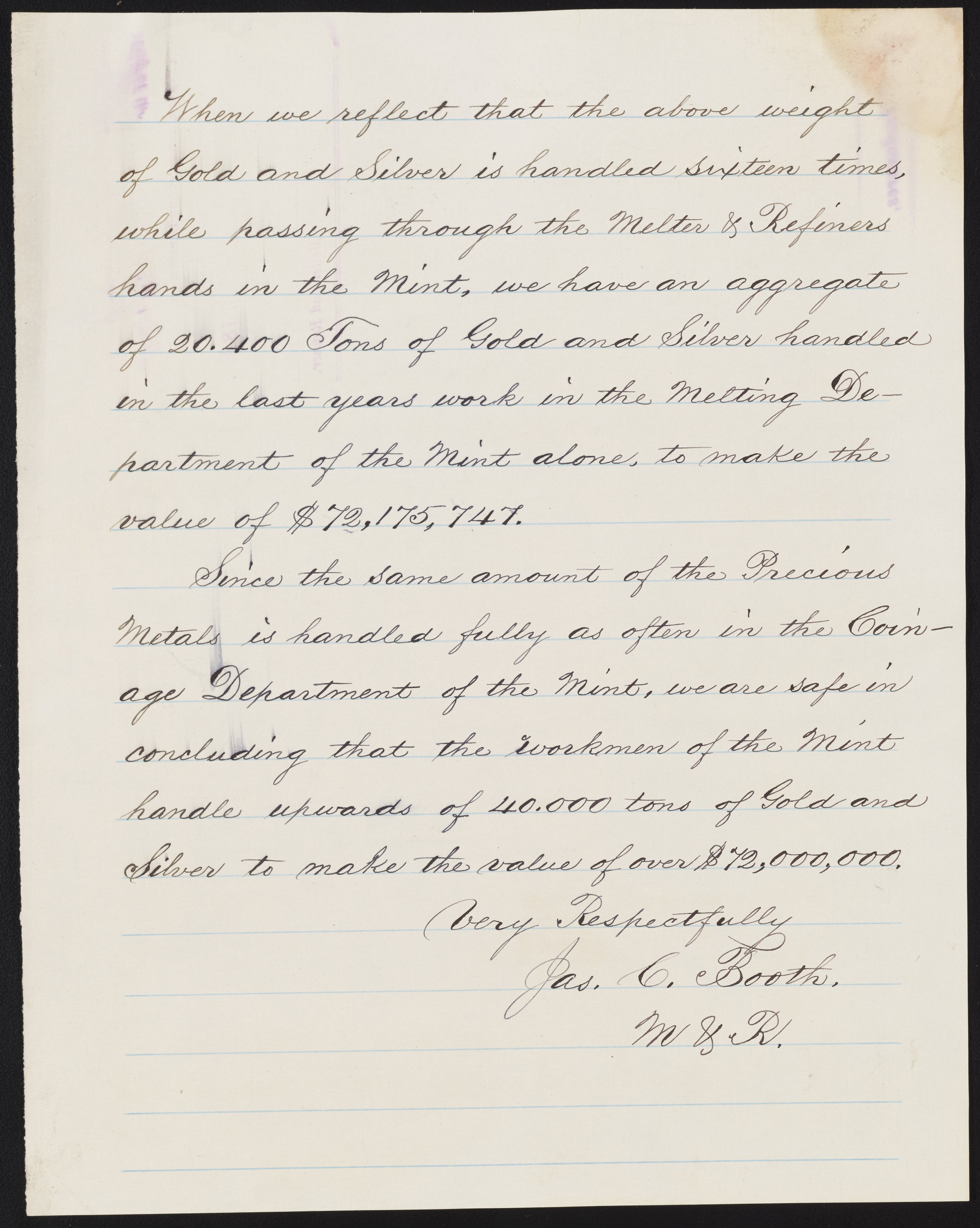 Small JPG1200 x 1514px — 201 KBLarge JPG2880 x 3633px — 926 KBFull-sized JPG5200 x 6560px — 2.5 MBOriginal fileTIFF — 5200 x 6560px — 97.7 MBJames Curtis Booth (1810-1888) sends a report on refining to Daniel M. Fox (1819-1890), Superintendent of the United States Mint at Philadelphia from 1885-1890.
