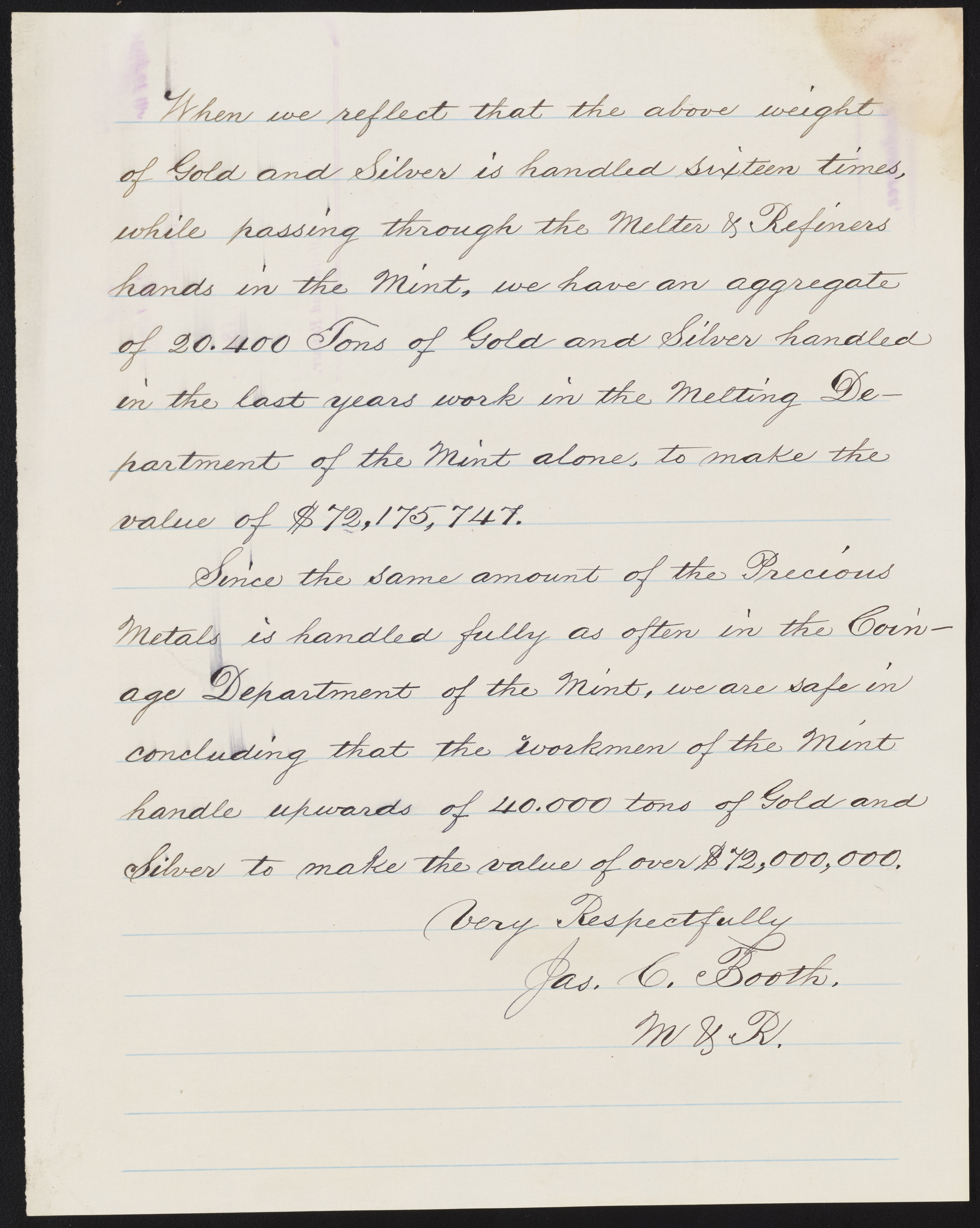 Small JPG1200 x 1514px — 201 KBLarge JPG2880 x 3633px — 926 KBFull-sized JPG5200 x 6560px — 2.5 MBOriginal fileTIFF — 5200 x 6560px — 97.7 MBJames Curtis Booth (1810-1888) sends a report on refining to Daniel M. Fox (1819-1890), Superintendent of the United States Mint at Philadelphia from 1885-1890.
